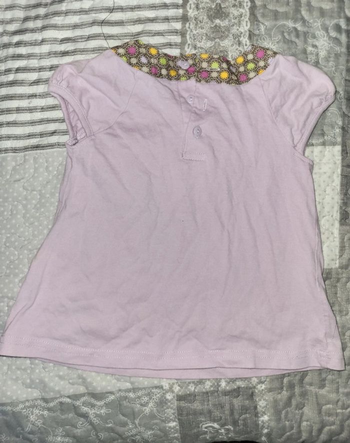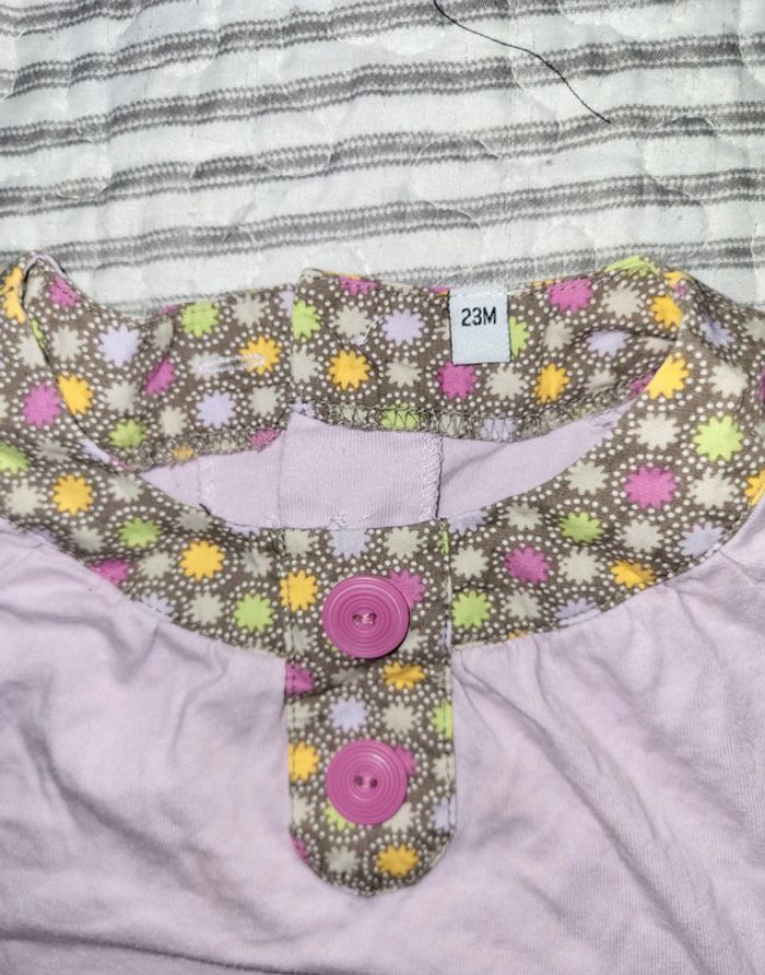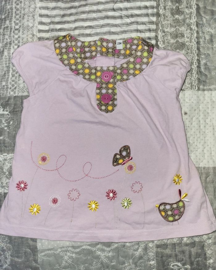 Tee shirt couleur violet lila avec des motifs de fleurs, papillon et un oiseau. Ouverture au dos avec boutons en taille 24 mois. Bon état. #floreteddy_taille24mois