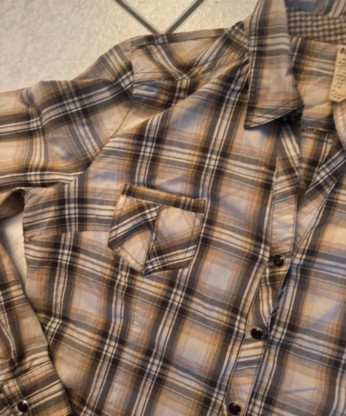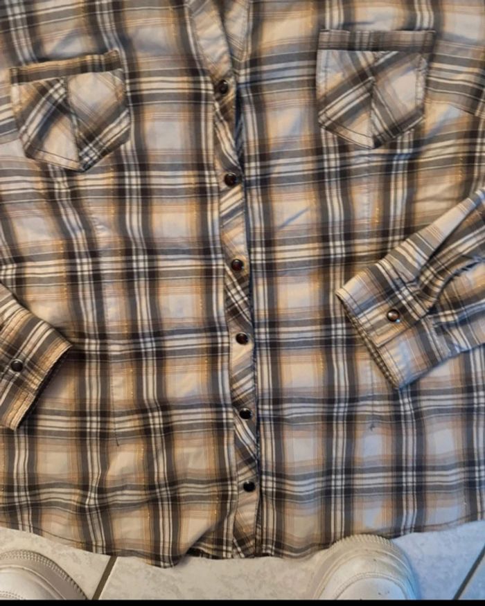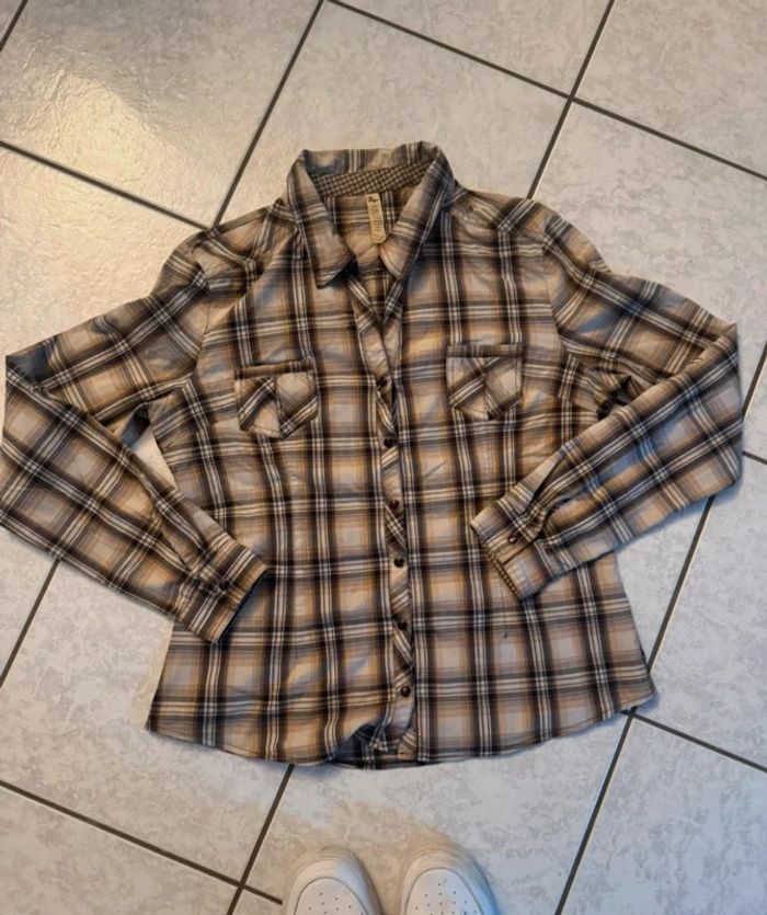 Chemise à carreaux beige marron et dorée de cache cache en taille 38, très bon état. #floreteddy_taille38