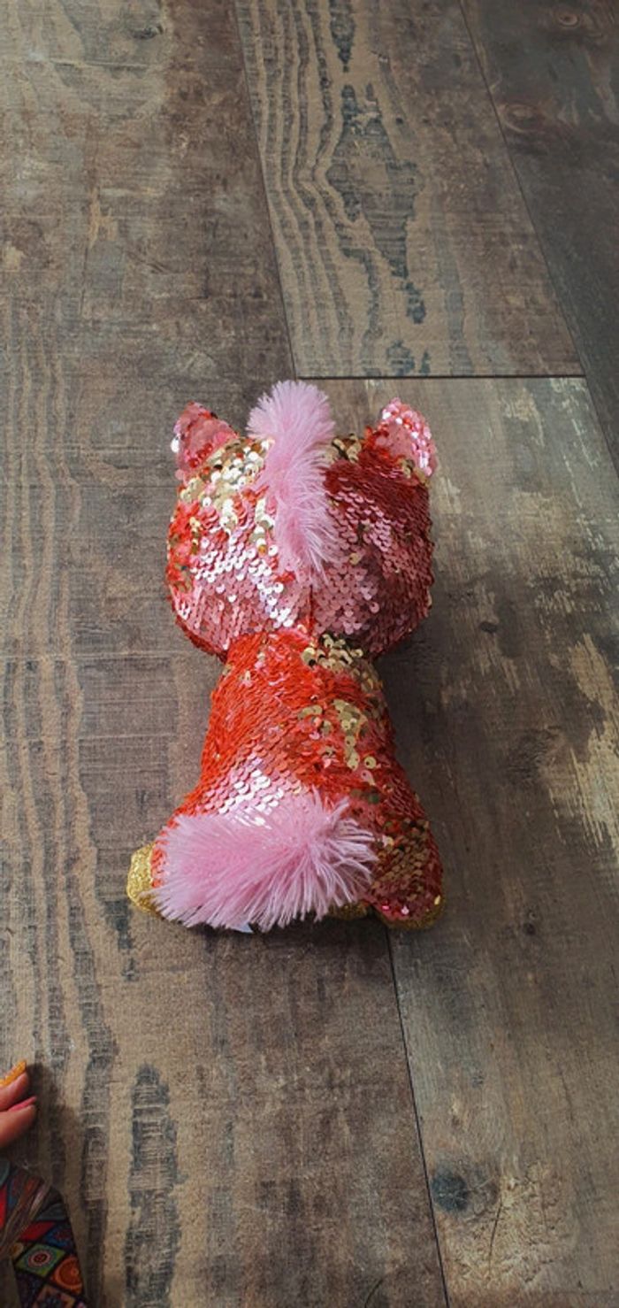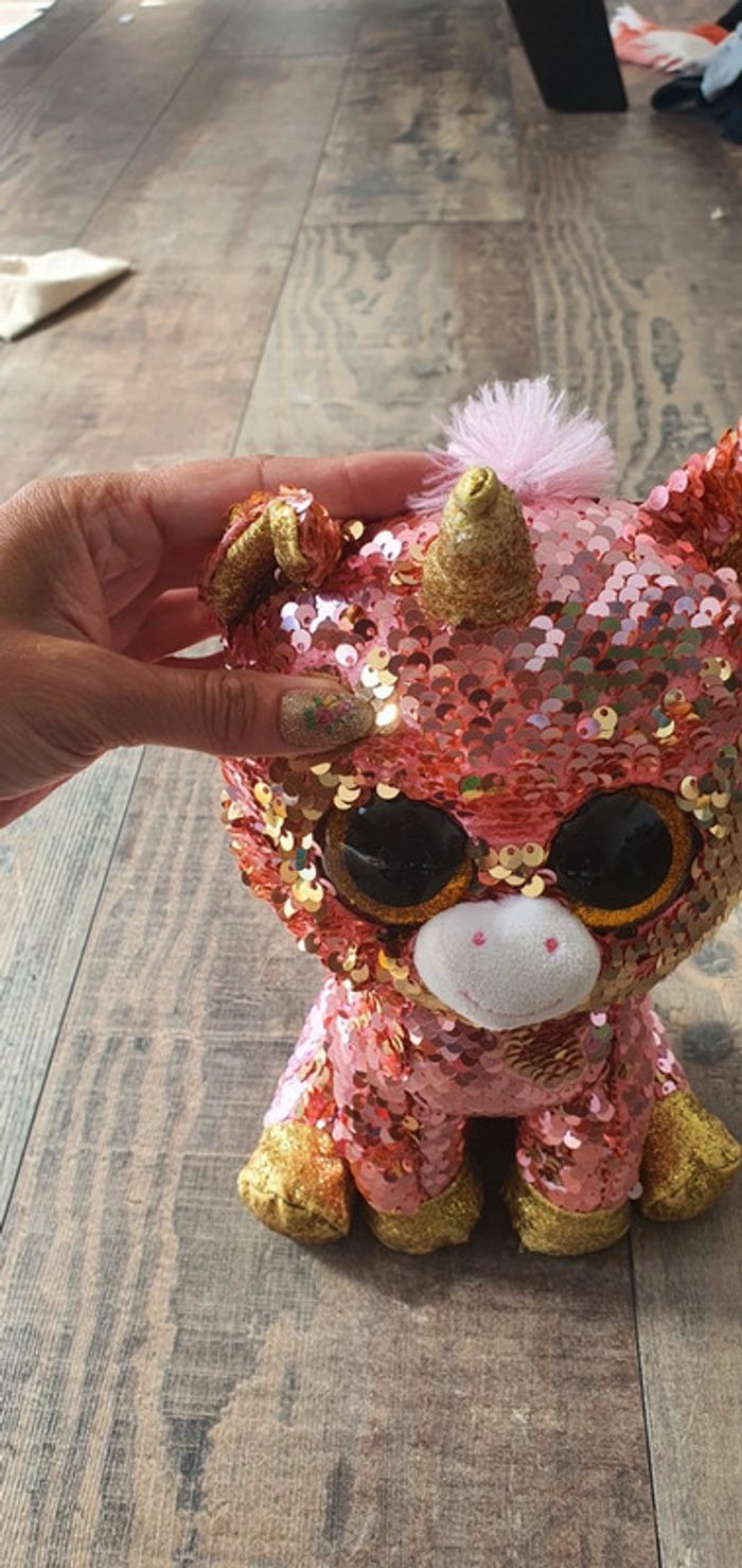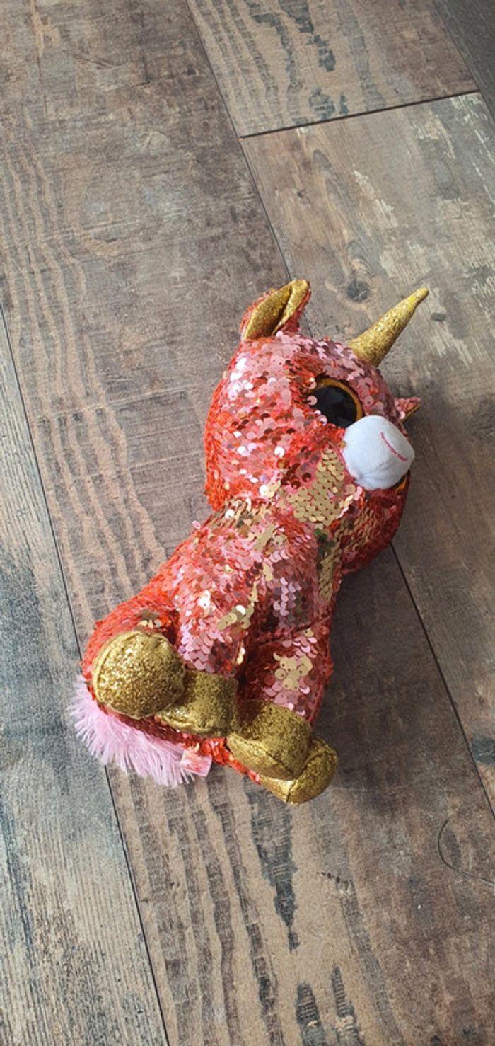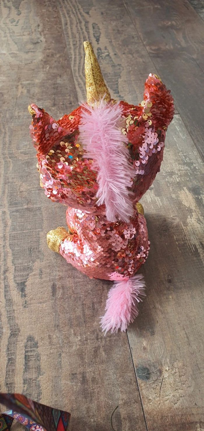 Peluche Licorne à sequins fera le plaisir de votre petit! Assise, elle mesure 15 cm depuis le haut de sa corne jusqu’à la pointe de ses pattes