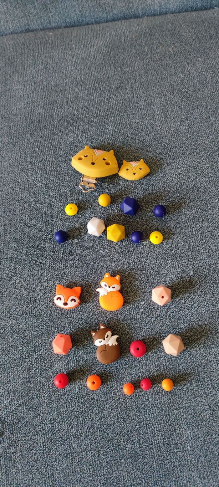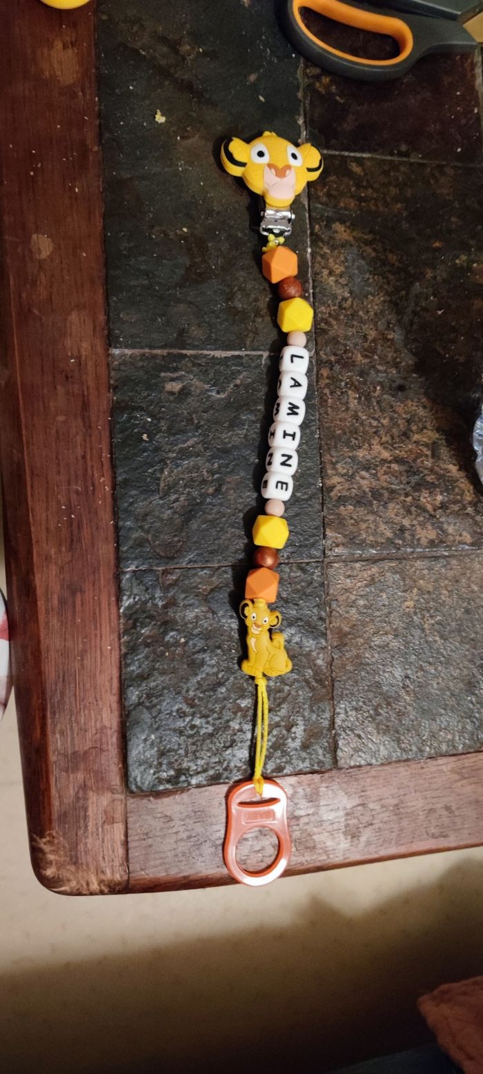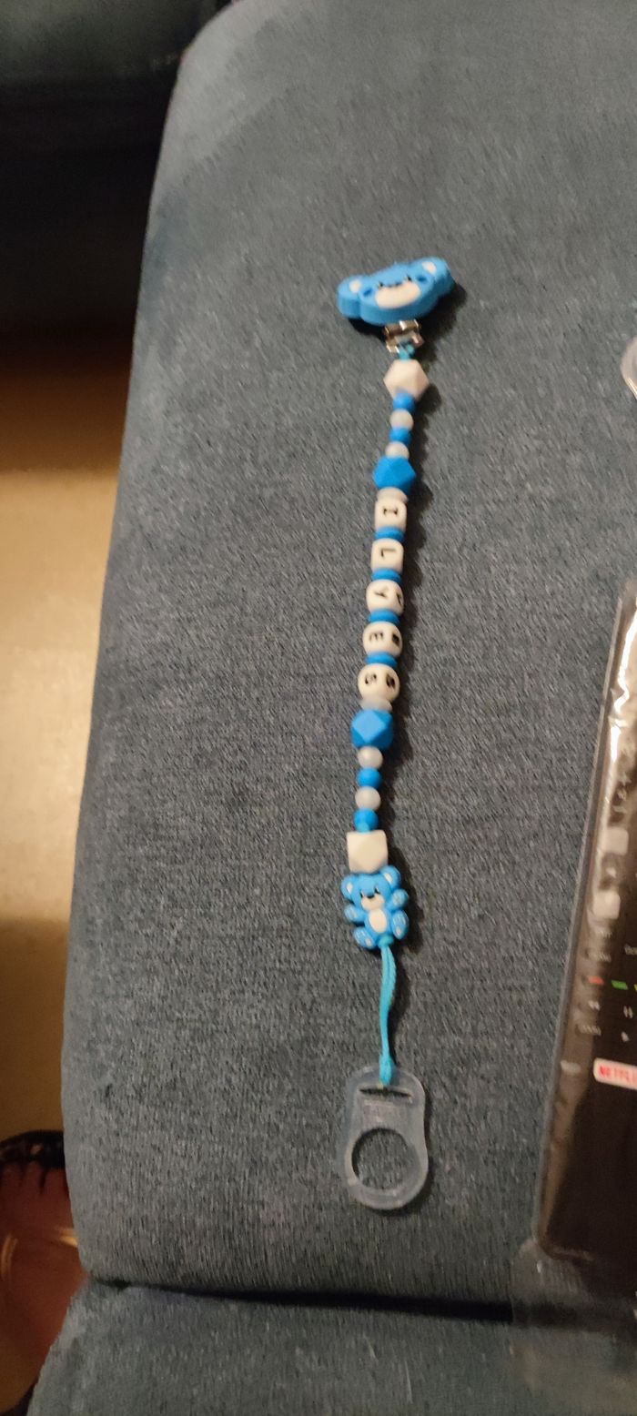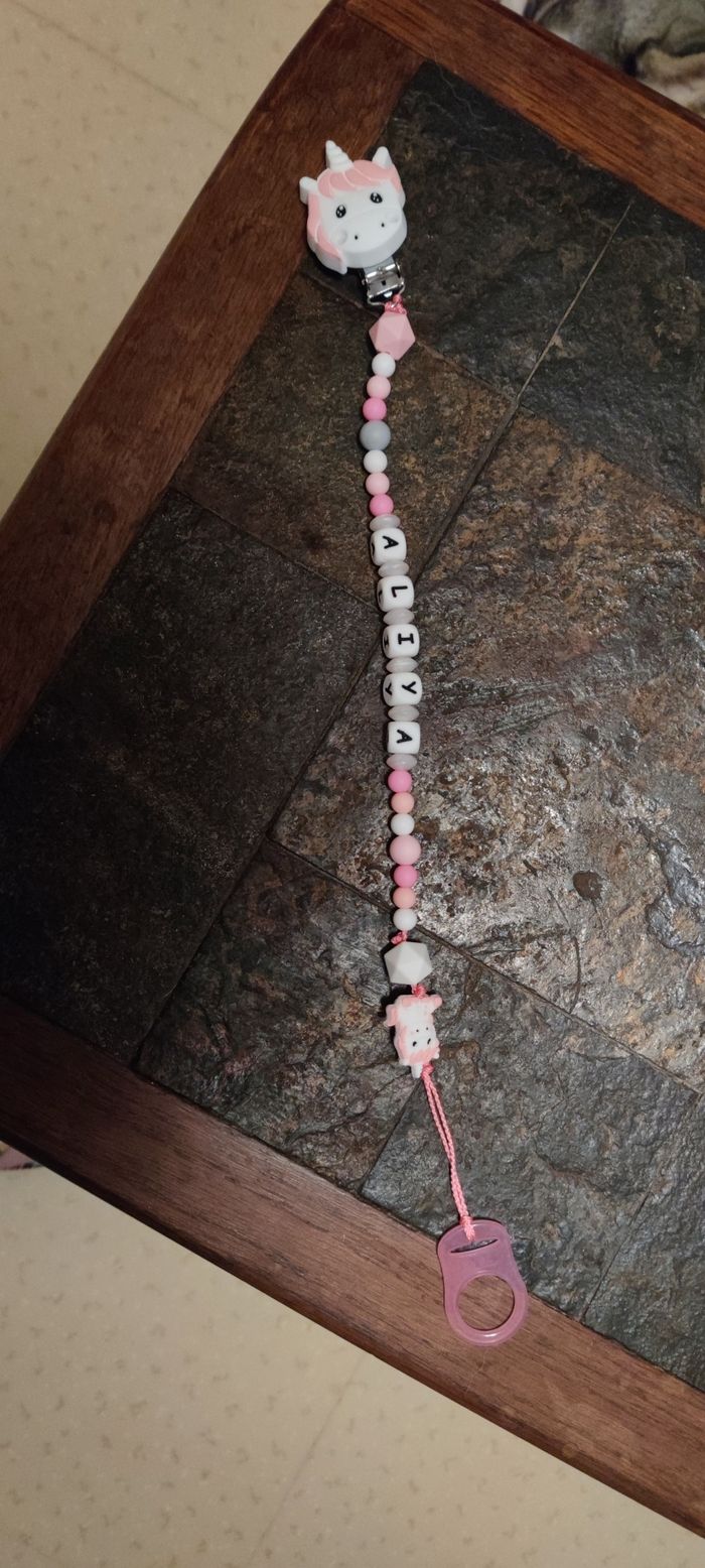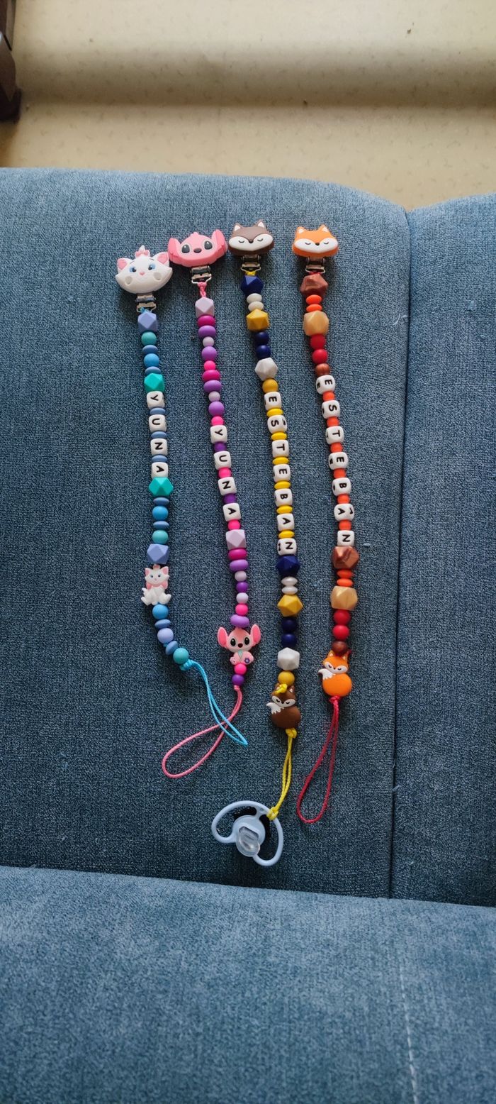 Bonjour je fabrique des attaches tétines pour vos petits bouts, personnalisées au prénom de votre enfant, avec les couleurs, les animaux, les perles et les formes de votre choix . Dites moi en message privé ce que vous souhaiter . Par contre les attaches tétines fabriquées en photo ne sont pas à vendre . Les perles sont en silicones sans BPA les enfants peuvent y mettre dans la bouche mais en toute SURVEILLANCE au cas où que cela se detacherai et surtout ne pas laisser l'attache tétine lorsque l'enfant dors au risque d'étouffement et d'étranglement. Elle reste très pratique lorsque vous la chercher pour aller chez la nounou ou en crèche . N'hésitez pas à me contacter pour de plus amples informations.