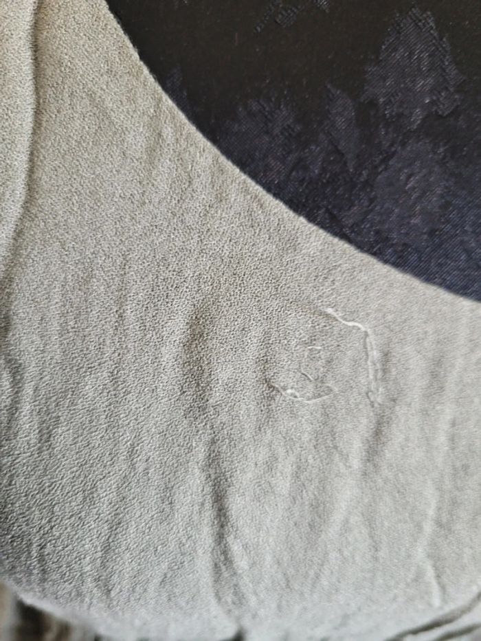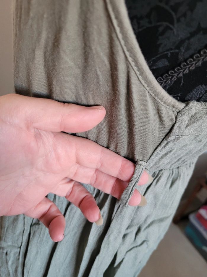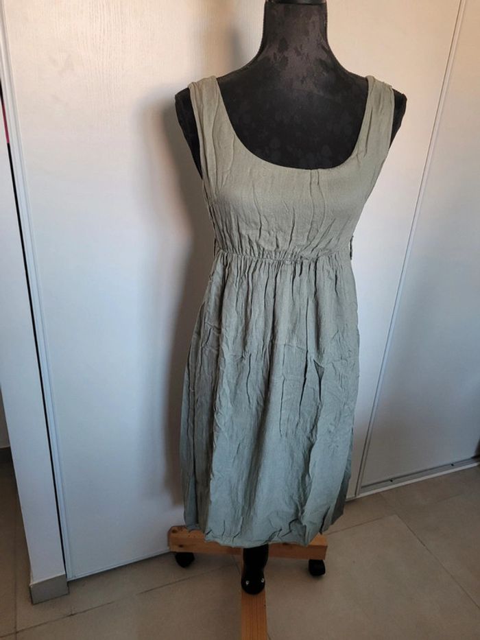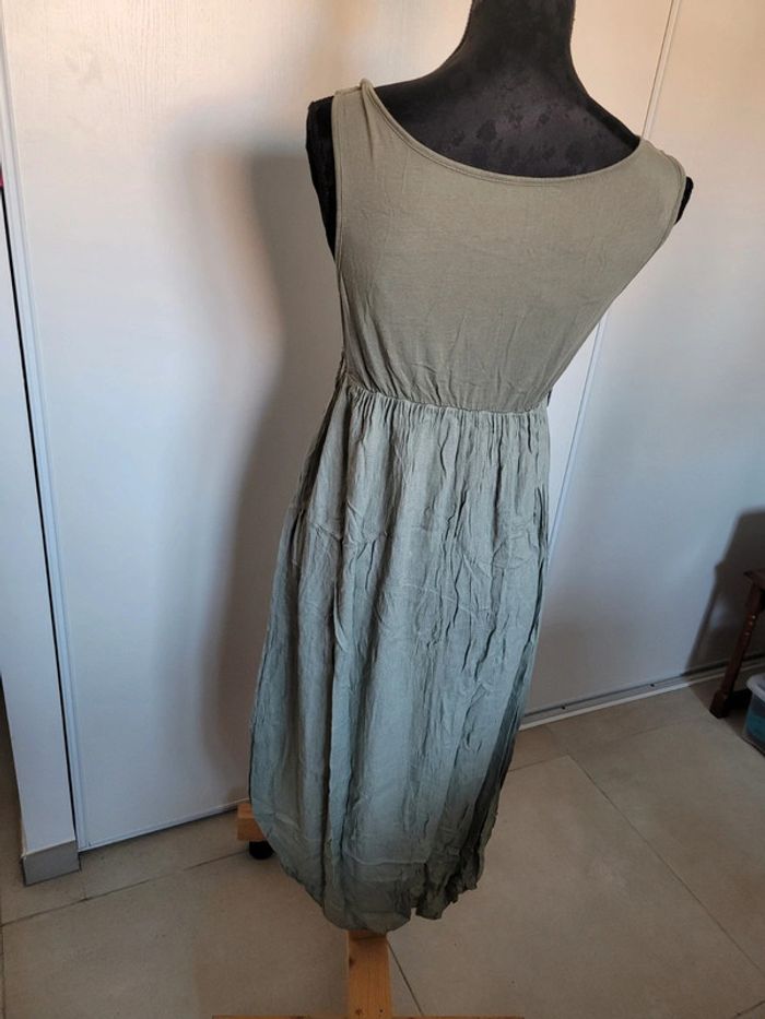 Robe asymétrique kaki taille 38. Un petit fil tiré et une petite tâche à l'arrière : cf les deux dernières photos. #jeannegomez_robes