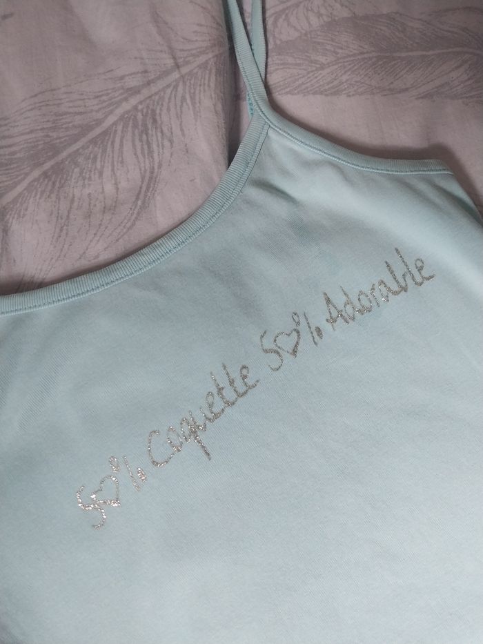 ✨ Inscription pailletée : "50% Coquette 50% Adorable" 🩵 Bretelles fines, matière douce et confortable 🔍 À noter : légère trace jaunie sous l’aisselle, peu visible une fois porté. 💧Encore parfait pour les journées d’été ou en vêtement de rechange ! 📏 Taille : 12 ans (marque Snpment) 📦 Envoi rapide et soigné #DébardeurFille #12ans #LookEstival #CoquetteEtAdorable #PetitPrix