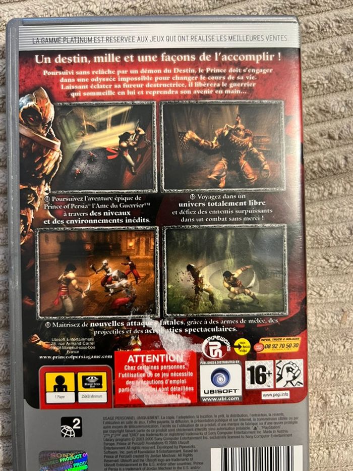 Ubisoft Prince Of Persia Revelations, PSP - Juego Très bon état Prince of Persia : Revelations - Sony PSP Traqué par une créature divine voulant sa mort, le Prince se rend sur l'île de l'Impératrice du Temps avec pour idée de faire en sorte que les sables du temps n'aient jamais été créés, et d'annuler la malédiction qui le poursuit. Prince of Persia Revelations sur PSP est un jeu d'action à l'atmosphère sombre et envoûtante. Reveillez le guerrier qui sommeille en vous et changez votre destinée.