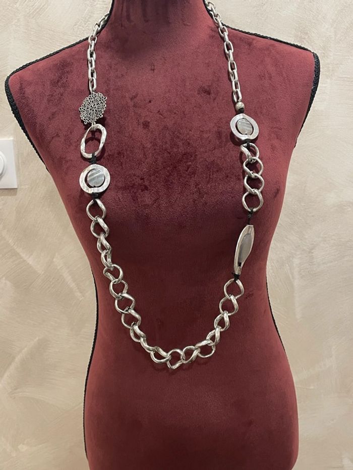 Collier long chaîne argentée à éléments fantaisie – État neuf Superbe collier long composé de maillons argentés martelés et d’éléments décoratifs originaux (médaillon ajouré, anneaux métalliques, perle nacrée…). Un bijou au style élégant et bohème, facile à porter avec toutes vos tenues. • Longueur généreuse : parfait sur un haut simple ou une robe fluide • Matière : métal argenté et détails fantaisie • État neuf, jamais porté