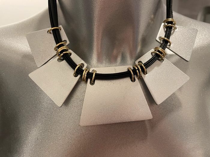 Collier graphique noir & argenté – État neuf Donnez du caractère à vos tenues ! Magnifique collier rigide composé de plusieurs cordons noirs ornés de pendentifs métalliques géométriques argentés et de détails dorés. Idéal pour un look moderne, chic ou arty. • Style : contemporain / original • Couleurs : noir, argent et or • État : comme neuf – jamais porté