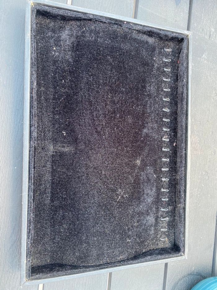 À VENDRE – lot de 2 Plateaux présentoir bijoux noir velours ✨ Idéal pour exposer vos bracelets, colliers ou chaînes ✨ Ce plateau en velours noir mettra en valeur vos plus belles pièces, que ce soit pour une utilisation personnelle ou professionnelle (bijoutier, créateur, exposant, etc.) ! Caractéristiques : • Dimensions : 35 cm x 24 cm • Tissu doux noir façon velours • Emplacements de fixation à droite (chaînettes, fermoirs, etc.) • Fond rigide, cadre solide • Parfait pour vitrines, expos ou rangement à la maison État : Bon état, quelques traces d’usage