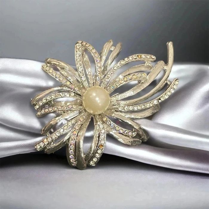 Splendide broche argentée avec strass et perle Manque 2 strass d’où le prix