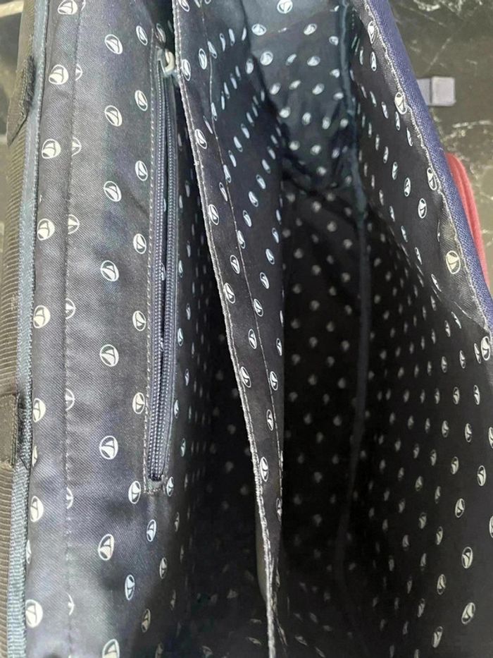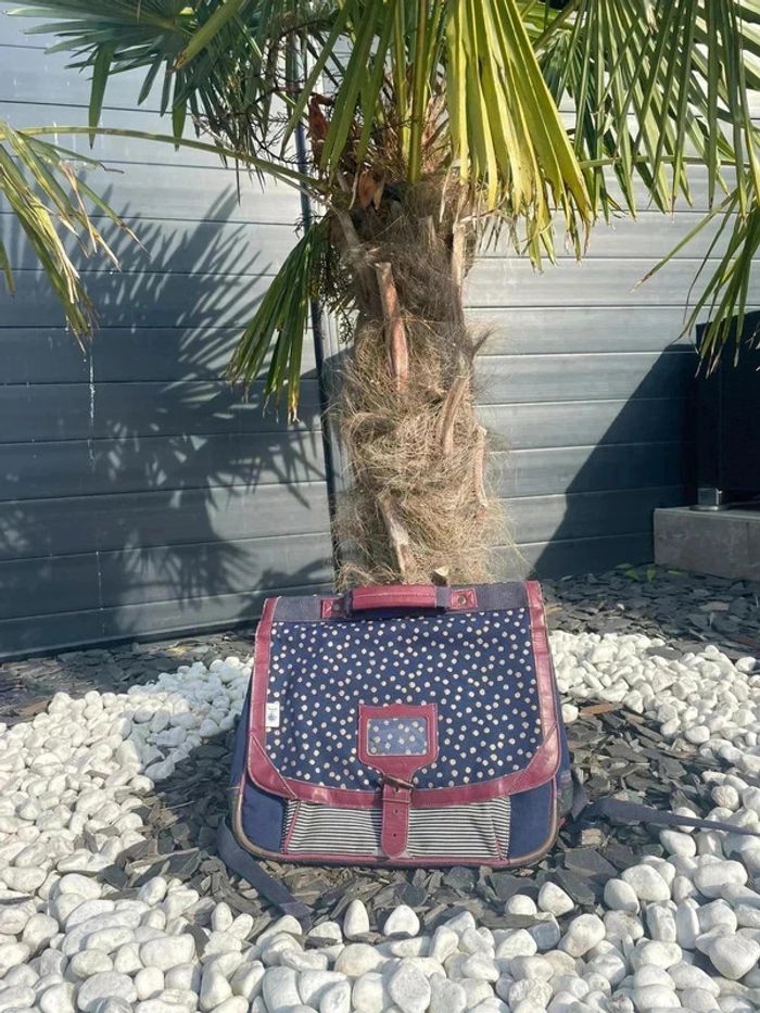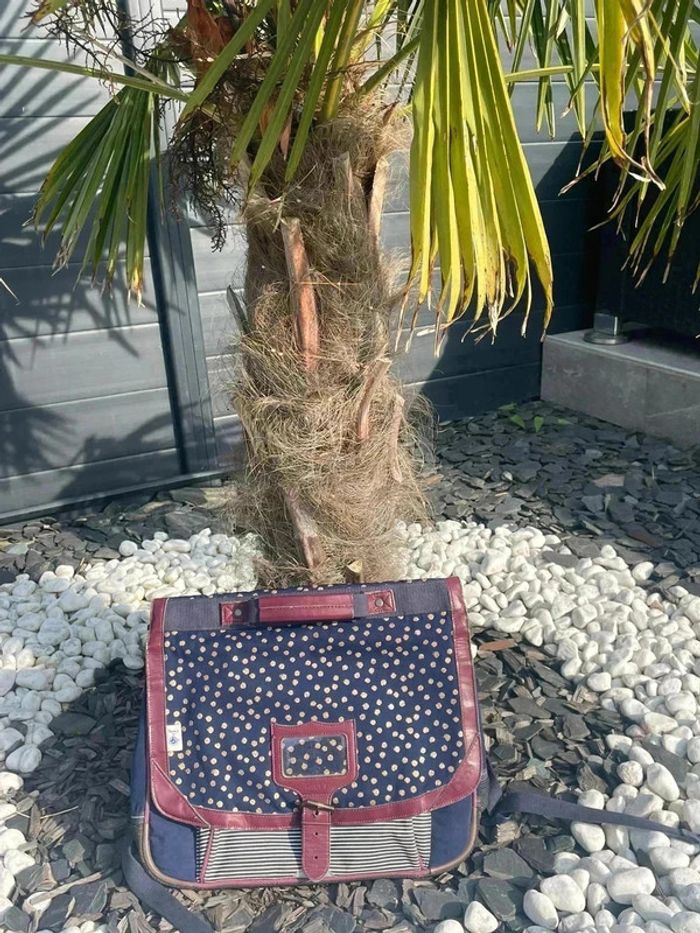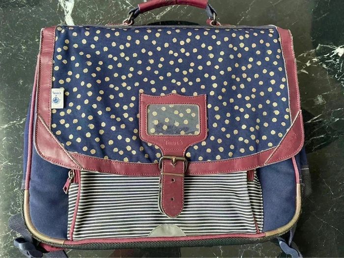 L’iconique cartable Tann’s en version bleu marine, souligné de bordeaux, est joliment décoré de pois dorés. Ce cartable Etincelle est à la fois sobre et girly. Collaboration avec petit bateau Le modèle Etincelle associe le bordeaux et le bleu profond.Couleur Bleu Dimensions : 38 x 31 x 15 cm Bon état