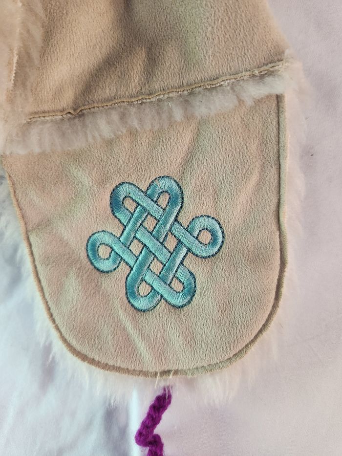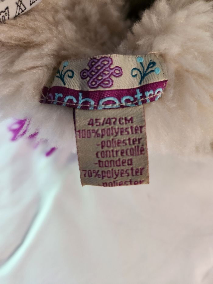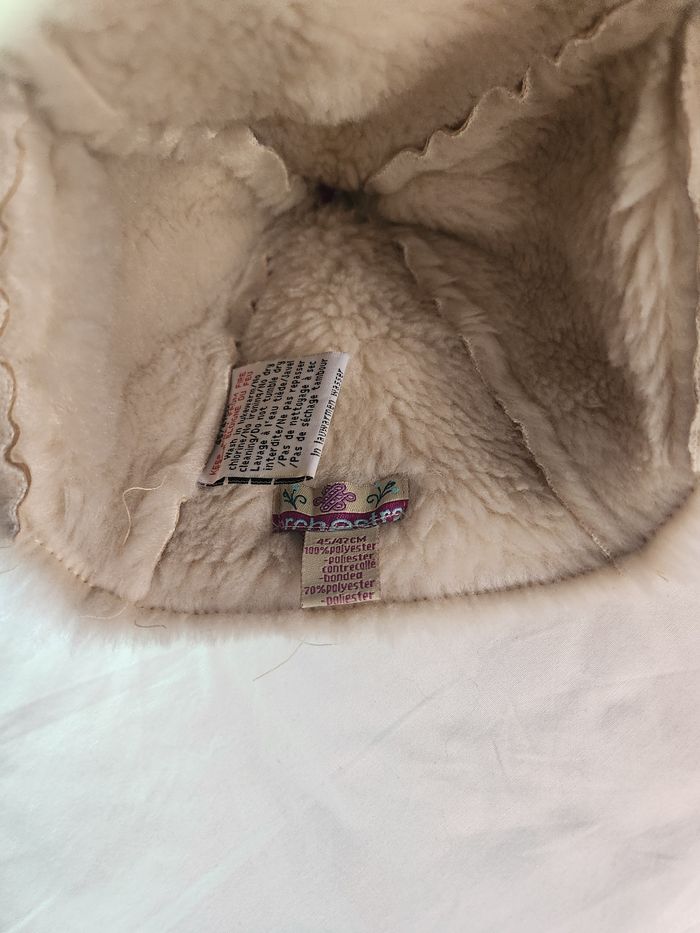 Joli bonnet bien chaud - taille 45/47 de tour de tête. En tres bon état. J'ai mis 9 mois mais cela dépend surtout du tour de tête de bébé.