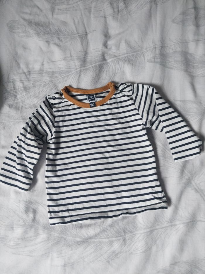 Craquant petit haut à rayures façon marinière, idéal pour un mini moussaillon ! 👶 Taille : 6 mois / 67 cm ⚓ Marque : Terre de Marins 🟠 Col moutarde contrastant 👕 Pressions aux épaules pour un habillage facile 💙 Très bon état #bébégarçon #terredemarins #marinière #6mois #lookmarin