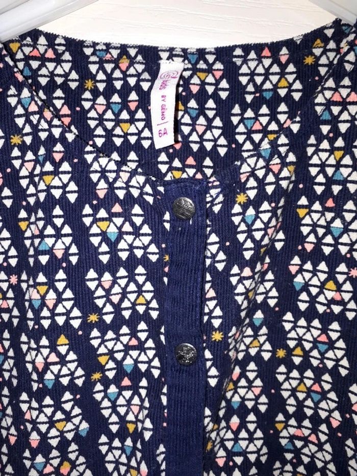 Robe bleu marine en velours ras Motifs triangles blancs, roses, jaunes,... Ouverture sur le devant par pressions 2 petites poches 100% coton Peut être portée avec une ceinture (non fournie) #virgy61fille6ans