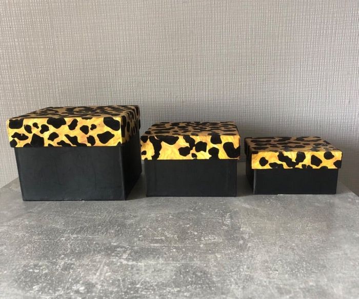 Lot 3 boîtes « léopard » 1. 14 x 14 cm H 11 cm 1. 12 x 12 cm H 8 cm 1. 11 x 11 cm H 6 cm