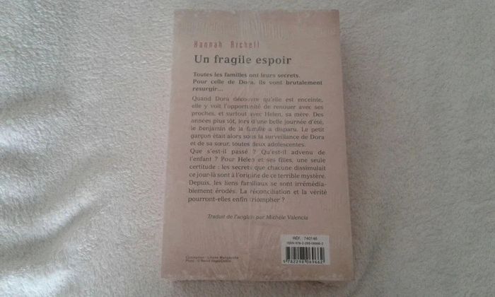 Livre neuf sous plastique Un fragile Espoir d Hannah Richell Toutes les familles ont leurs secrets. Pour celle de Dora, ils vont brutalement ressurgir... Quand Dora découvre qu'elle est enceinte, elle y voit l'opportunité de renouer avec ses proches, et surtout avec Helen, sa mère. Des années plus tôt, lors d'une belle journée d'été, le benjamin de la famille a disparu. Le petit garçon était alors sous la surveillance de Dora et de sa soeur, toutes deux adolescentes. Que s'est il passé? Qu'est il advenu de l'enfant? Pour Helen et ses filles, une seule certitude: les secrets que chacune dissimulait ce jour là sont à l'origine de ce terrible mystère. Depuis les liens familiaux e sont irrémédiablement érodés. La réconciliation et la vérité pourront elles triompher? #virgy61livresadulte