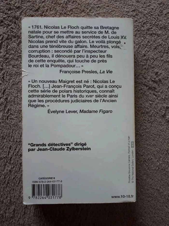 ISBN 9782264031778 10/18 Grands détectives " 1761. Nicolas Le Floch quitte sa Bretagne natale pour se mettre au service de M. de Sartine, chef des affaires secrètes de Louis XV. Nicolas prend vite du galon. Le voilà plongé dans une ténébreuse affaire. Meurtres, vols, corruption : secondé par l'inspecteur Bourdeau, il dénouera peu à peu les fils de cette enquête, qui touche de près le roi et la Pompadour... " Françoise Presles, La Vie " Un nouveau Maigret est né : Nicolas Le Floch. [...] Jean-François Parot, qui a conçu cette série de polars historiques, connaît admirablement le Paris du XVIIIe siècle ainsi que les procédures judiciaires de l'Ancien Régime. " Évelyne Lever, Madame Figaro #virgy61livresadulte