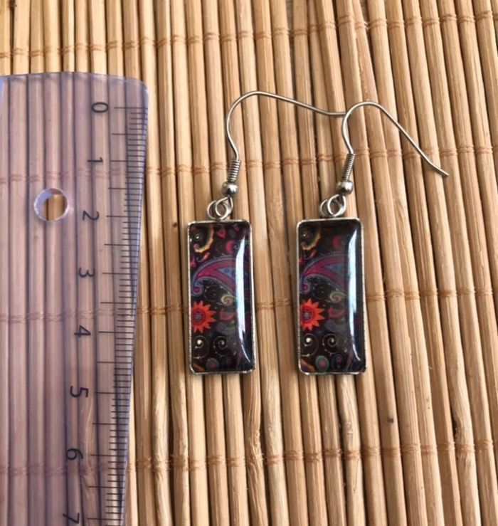 Bonjour Boucles d’oreilles style ethnique, fond noir à motifs. En très bon état puisque jamais portées. #carinelpcbijoux #carinelpcbouclesdoreilles