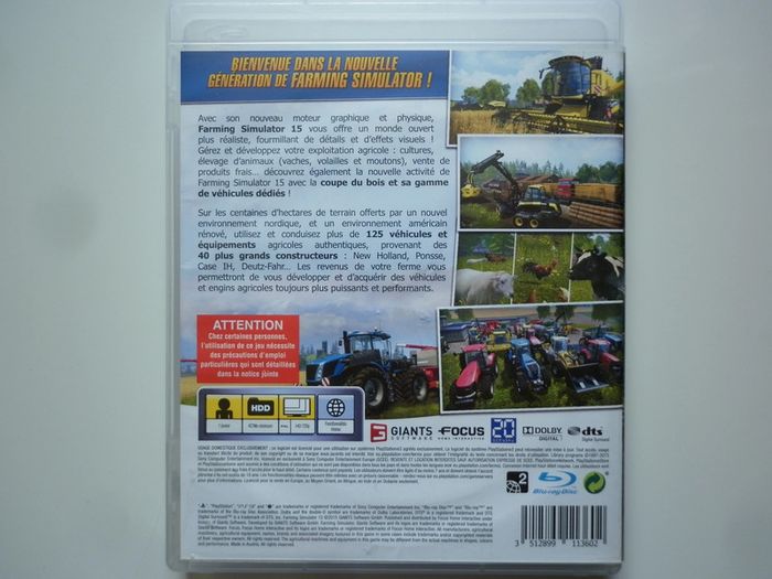 Farming Simulator 15 Jeu Vidéo "PS3" Playstation 3 (en très bon état). Inclus le boitier d'origine et le livret.Allez voir mes autres objets!!
