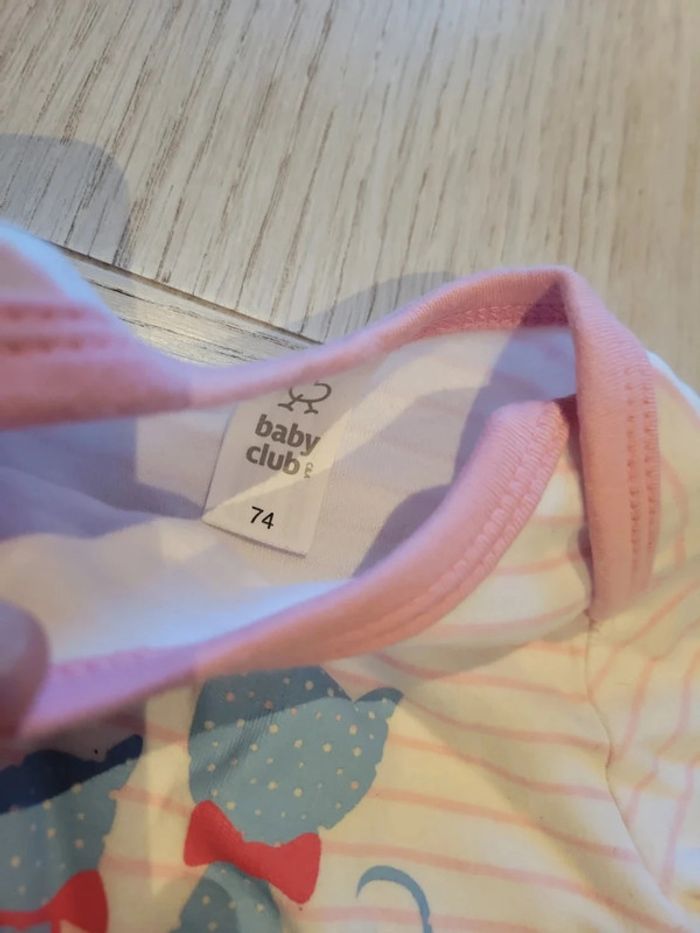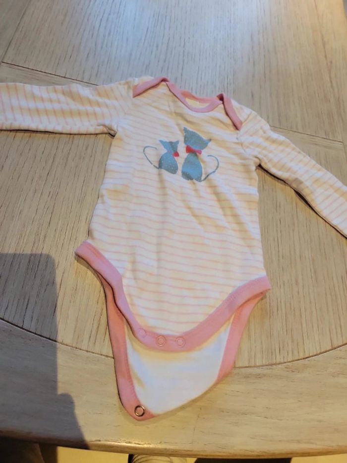 Body fille manches longues. Taille 74. Baby club. Blanc avec rayures roses et motifs chats. Très bon état #33coco_fille12mois