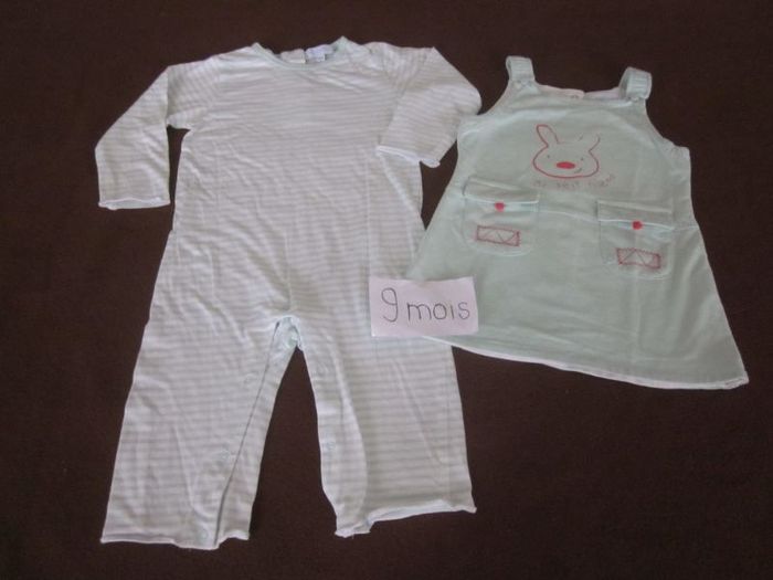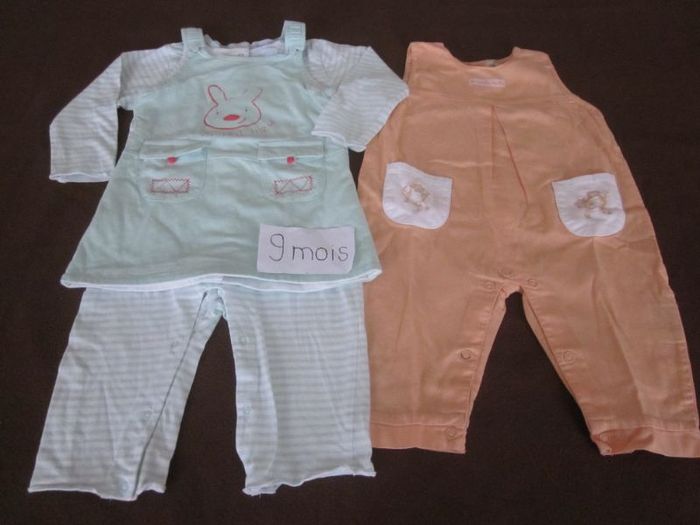 9 mois, barboteuse + ensemble 2 pièces (combi sans pied + robe salopette)