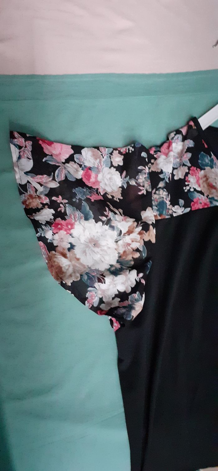 Vends un top large 100 % polyester, manches en voile, lien à nouer à l'encolure, couleur noir avec épaules et manches fleuries, taille 5XL sur l'étiquette, correspond à une taille 56 d'après les mesures. Longueur dans le dos : 72 cm Largeur aisselle à aisselle : 75 cm.