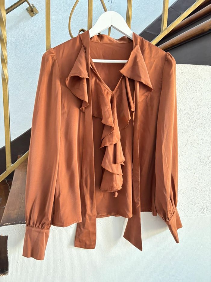 Chemisier volant avec col lavallière Taille unique Ocre / marron Très féminin Effet satinée #chemisier #blouse #volant #satine #satin #ocre #marron Blouse satin frill lavallière collar ochre Blusa volante satén cuello lazada mostaza Top satijn ruches lavallièrekraag oker Camisa babado acetinado gola laço âmbar Camicetta volant raso colletto lavallière senape Bluse Volant Satin Schleifenkragen honiggelb Blús satin ruffle cuim lavallière ómrach