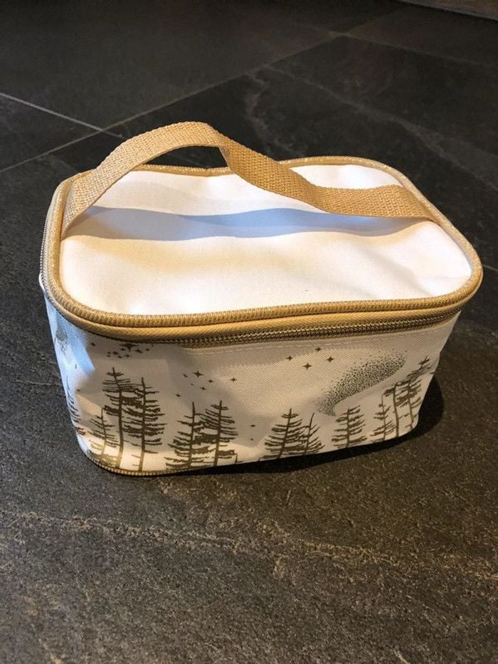pochette - trousse de rangement pour maquillage produit de beauté pratique pour les voyages marques yves rocher couleur blanc et doré