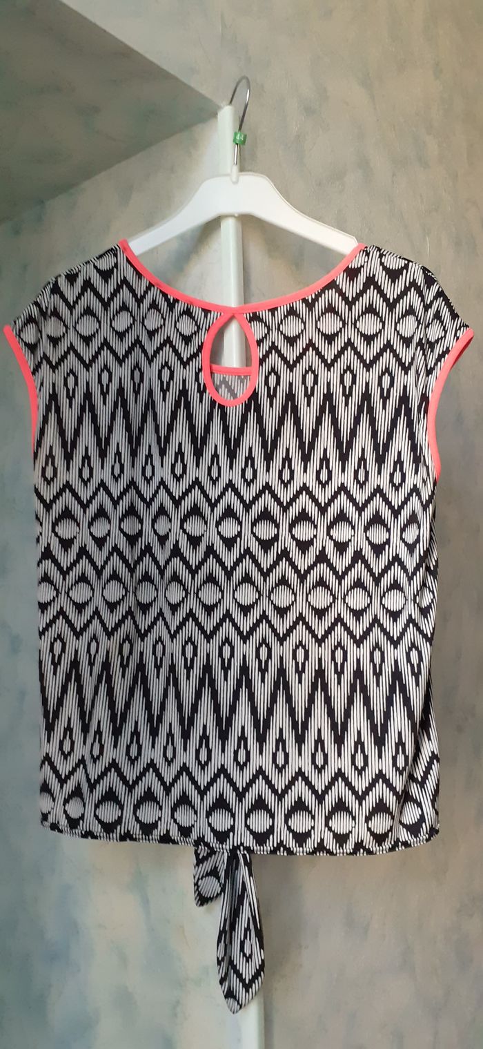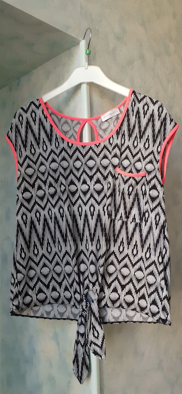 Vends un top sans manche, fluide, 95 % polyester, 5 % élasthanne, découpe dans le dos, lien à nouer devant, couleur blanc et noir avec bordures corail, marque Cache Cache, taille 1 sur l'étiquette, correspond à une taille 38-40 d'après les mesures. Longueur dans le dos : 51 cm Largeur aisselle à aisselle : 46 cm Largeur au niveau des hanches : 50 cm.