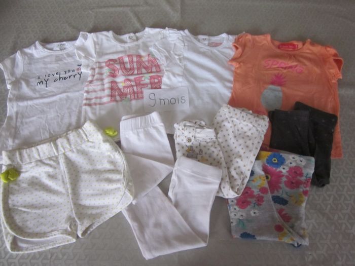 9 mois, 4 leggings + 5ème offert (tâche) + short + 4 hauts mc, kiabi, orchestra, kitchoun, sergent major