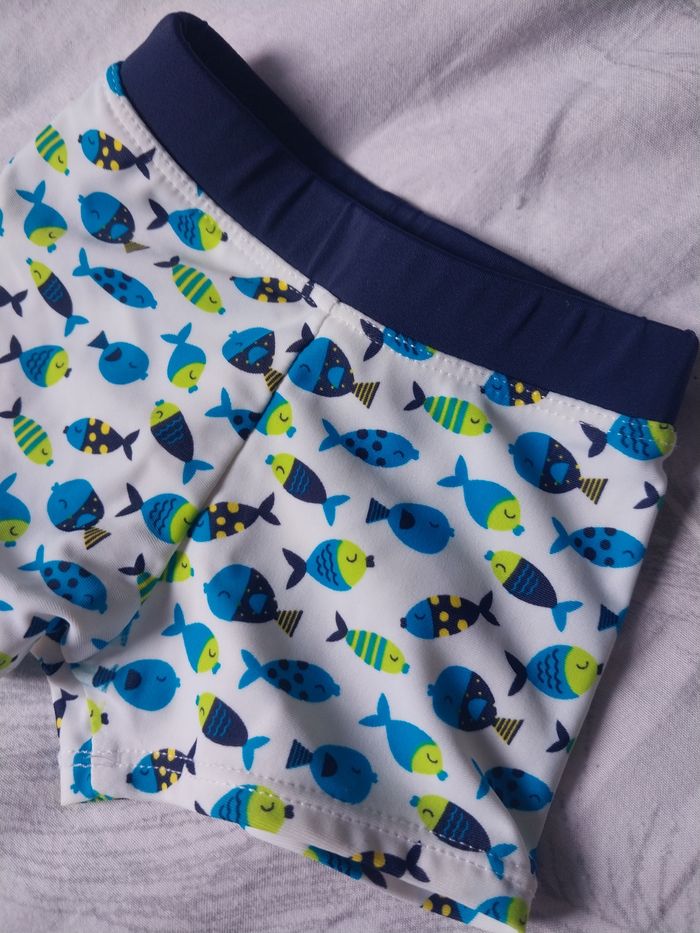 Adorable boxer de bain pour bébé, motif poissons trop mignons en bleu, vert et jaune sur fond blanc.