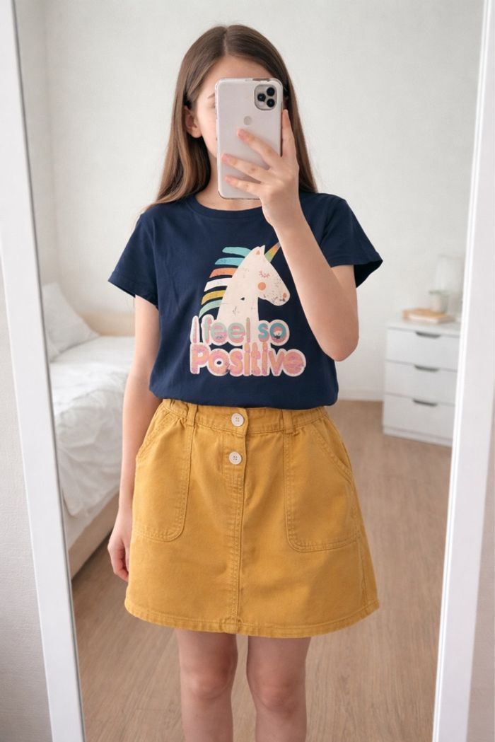 Ensemble jupe en jean moutarde et t-shirt marine licorne 8/10ans - photo numéro 3