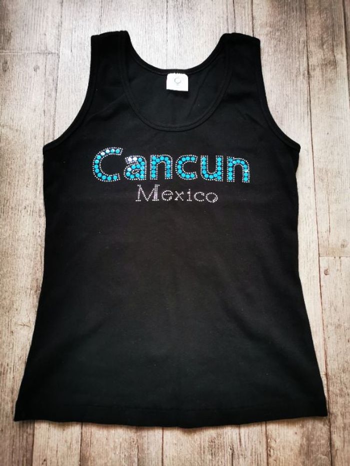 Débardeur stretch taille 38 avec strass et sequins, très bon état.