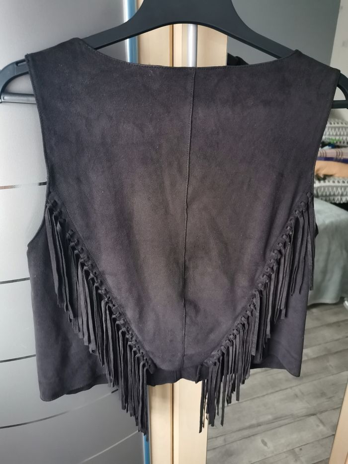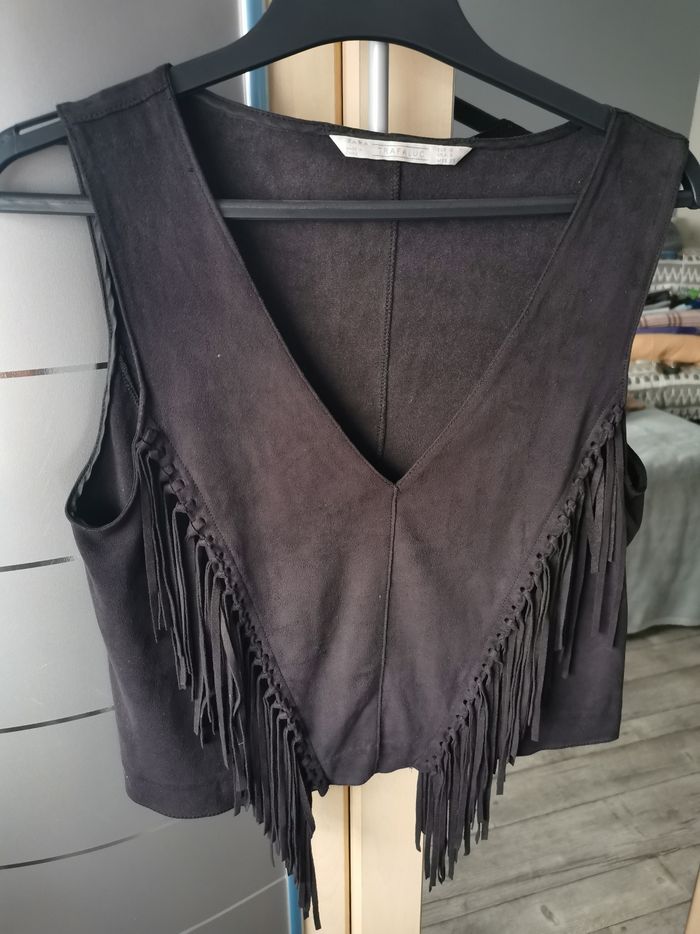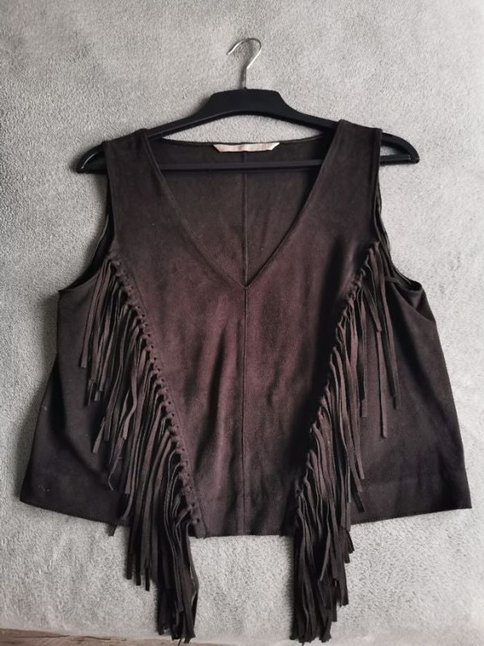 Petit top Zara taille S, effet daim, avec franges, col en V, très bon état.