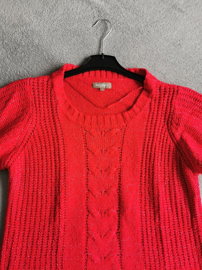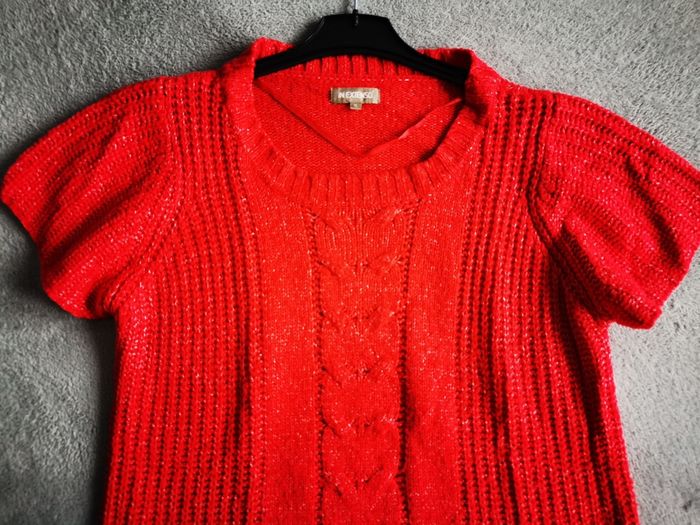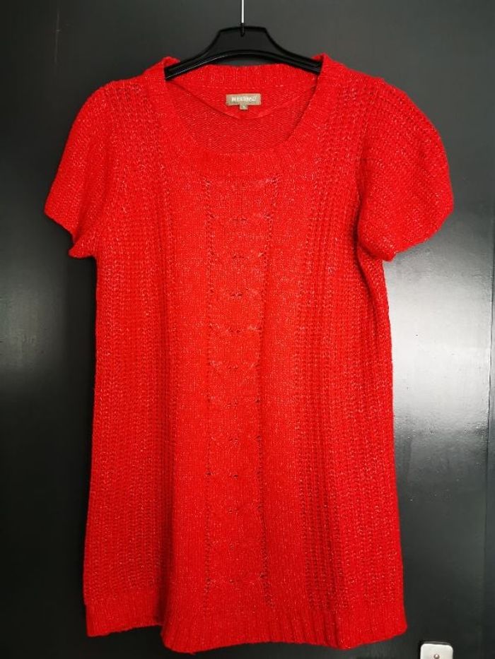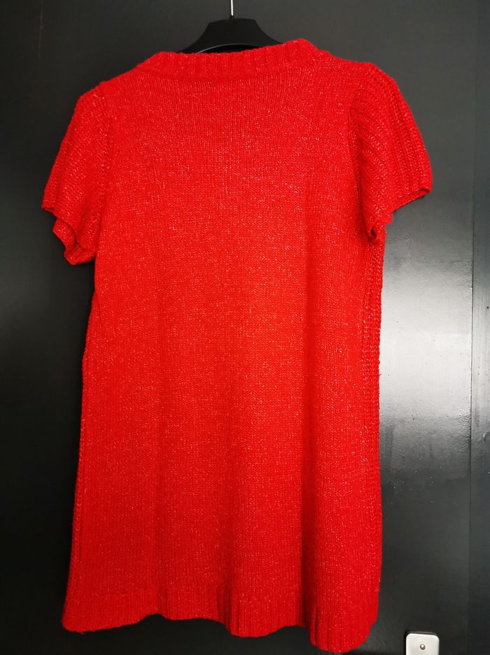 Robe pull ou tunique longue rouge avec fil blanc taille XL, épaules légèrement bouffantes, bon état.