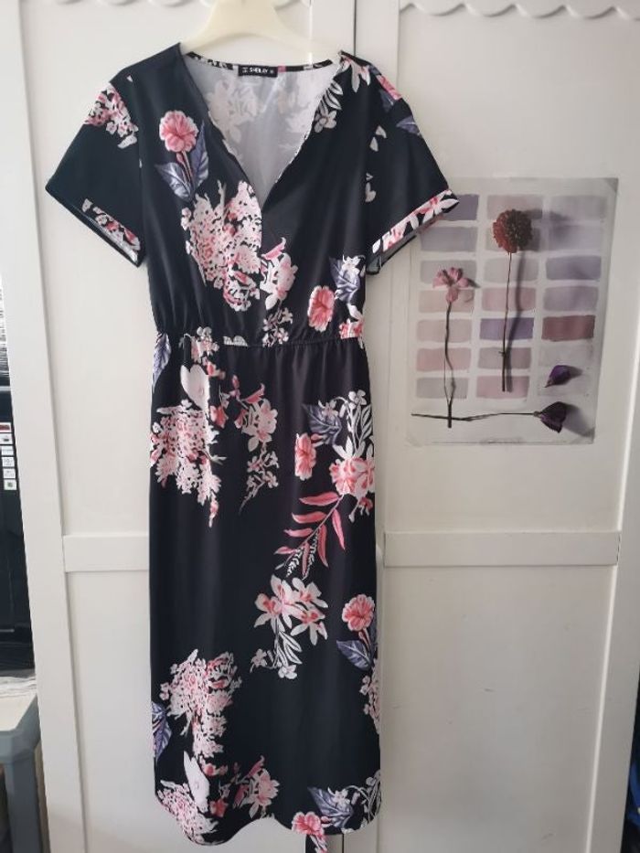 Robe longue fleurie Sheilay taille S, taille grand, convient à un S/M, élastique à la taille avec ceinture, évasé en bas sur les côtés, col en V, parfait état.