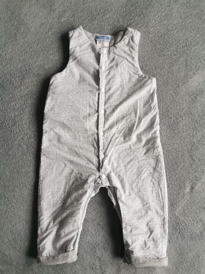Salopette Jacadi 12mois à carreaux gris et bleu, boutons pression aux jambes.