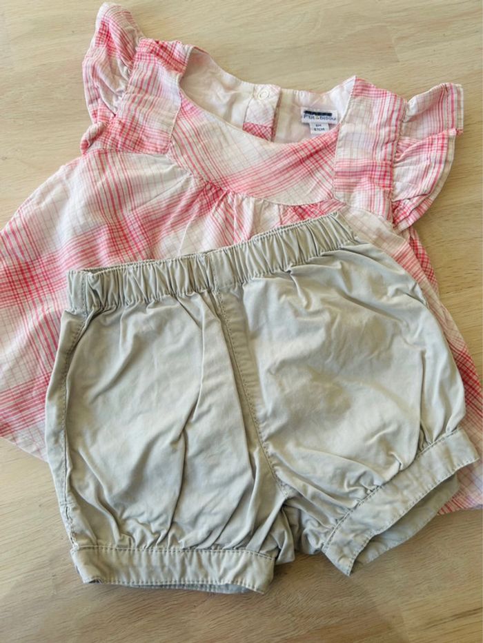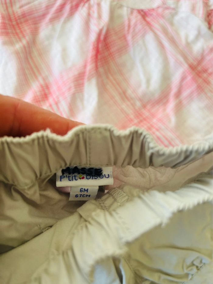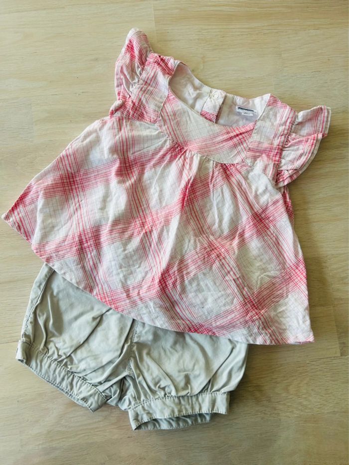 Ensemble composé de : - 1 blouse manches courtes 6 mois 67 cm P'tit bisou. Ouverture complète pression dos. -1 short P'tit Bisou 6 mois 67cm. #ptitbisoufille6mois