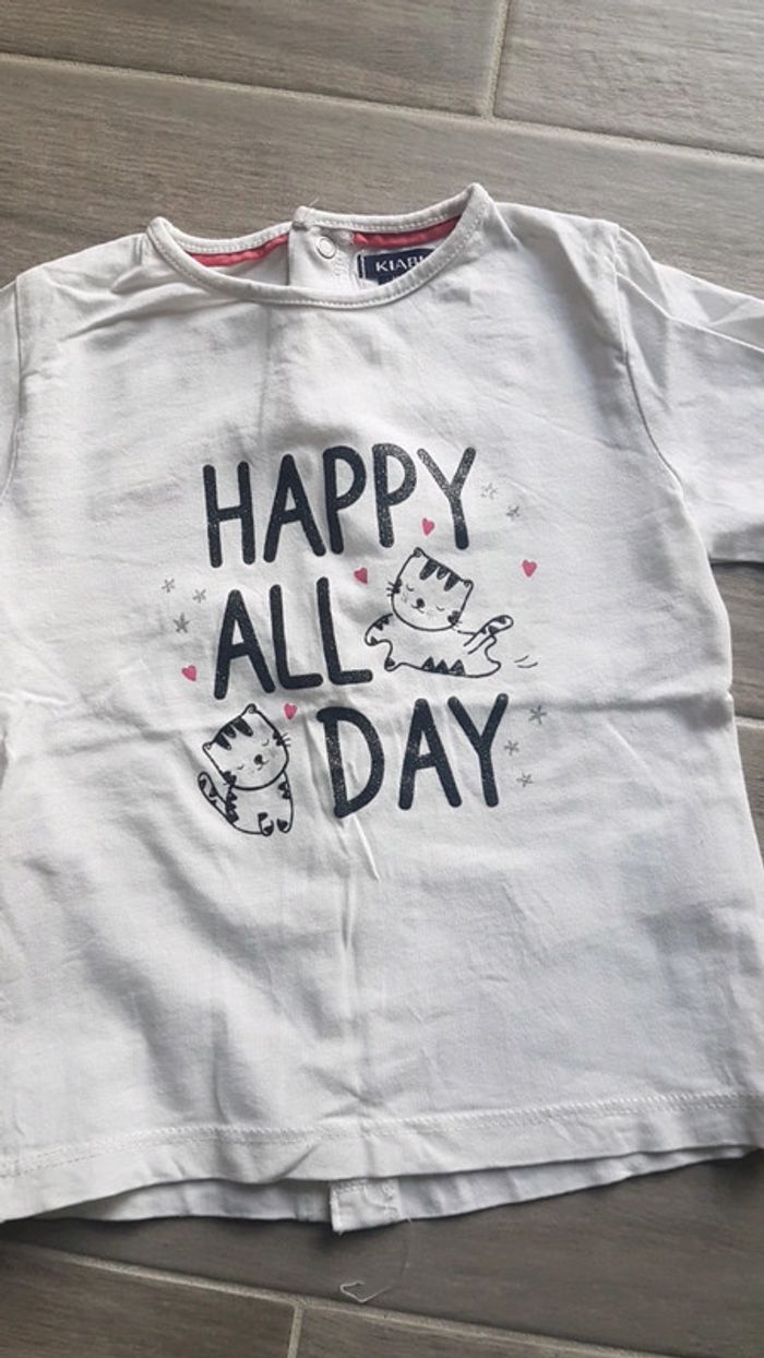T-shirt Kiabi manches longues 12 M 73-76 cm 10 kg. Dessins et inscriptions paillettés. État neuf. #kiabi #kiabifille #chat #12moisfille