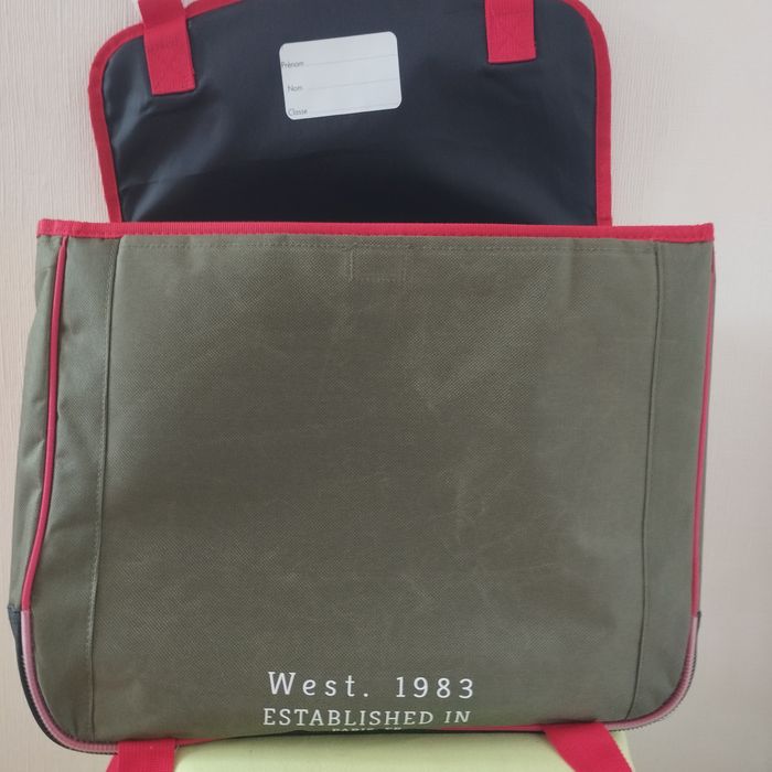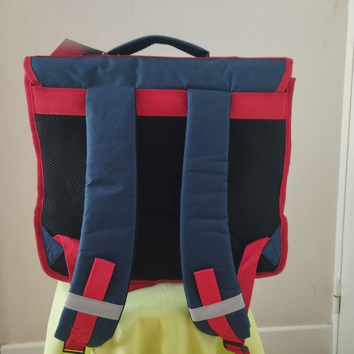 Grand cartable pour écolier ou collégien. Neuf. 3 compartiments, une poche avant s'ouvre par scratch, dos, bretelles et poignet rembourrés, bandes réfléchissantes, Couleurs Marine rouge et kaki, cartable de Hauteur 34cm, Largeur 41cm, Profondeur 16cm, Poids 700grs. De La Plume Dorée.