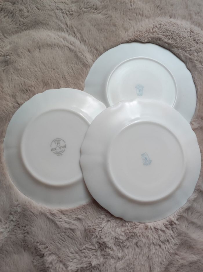 Ensemble de 3 assiettes semi plates de arcopal, décor Fleurie. Édition pois de senteur. En parfait état. Dimensions Diamètre central 14 cm Diamètre total 23,5 cm Hauteur 2 cm