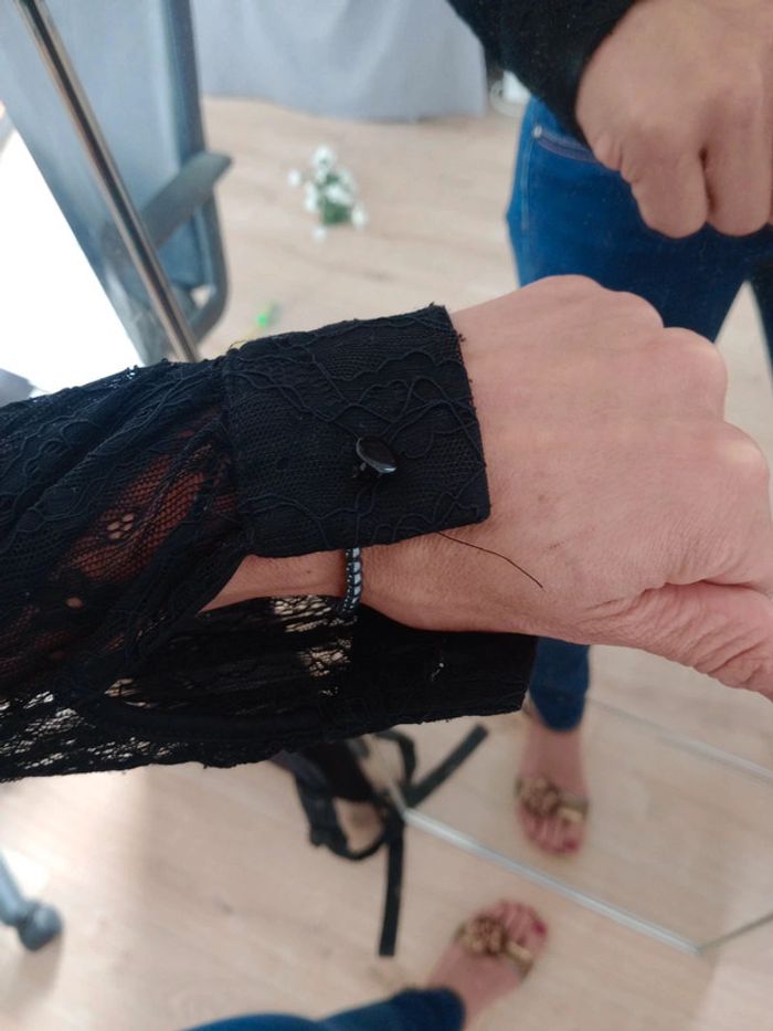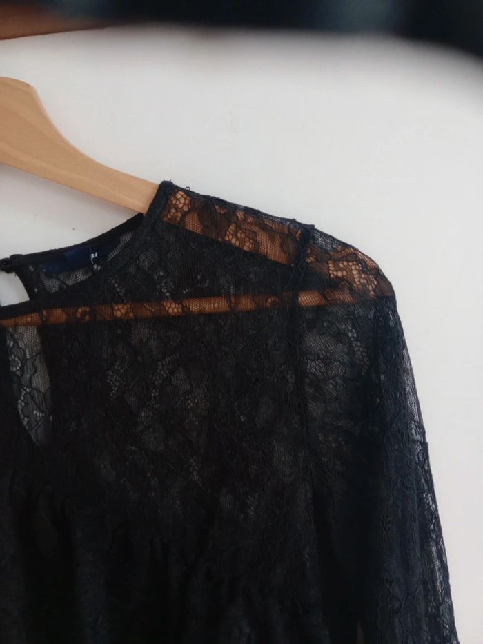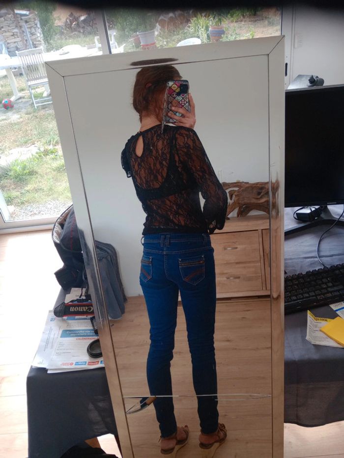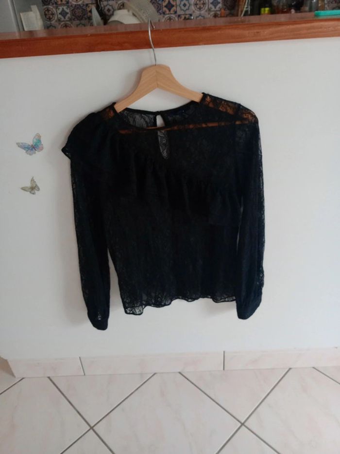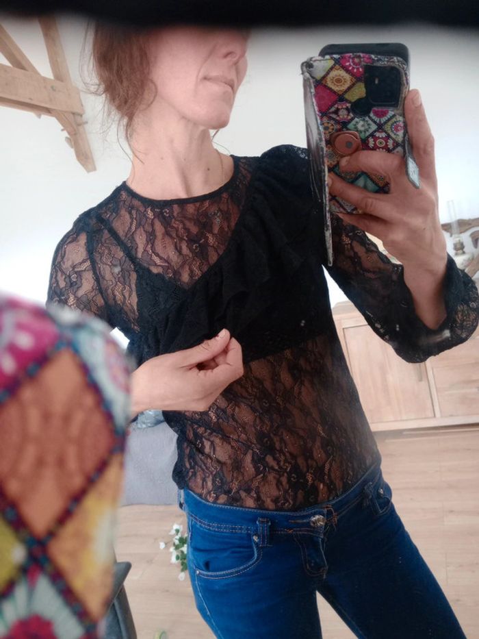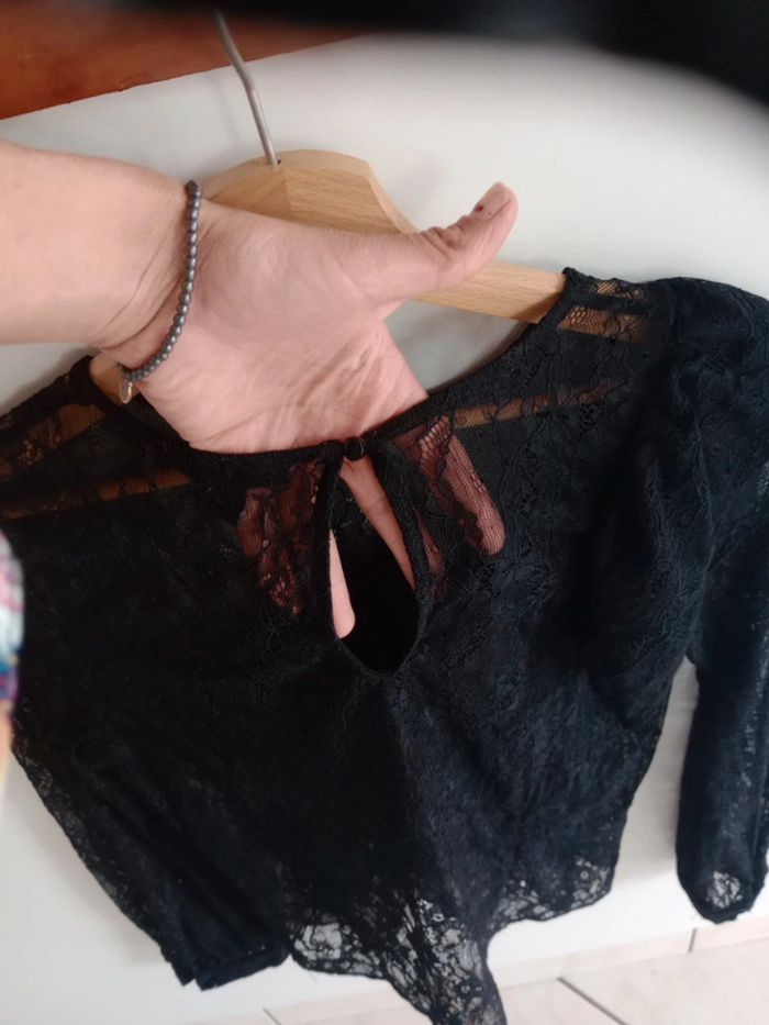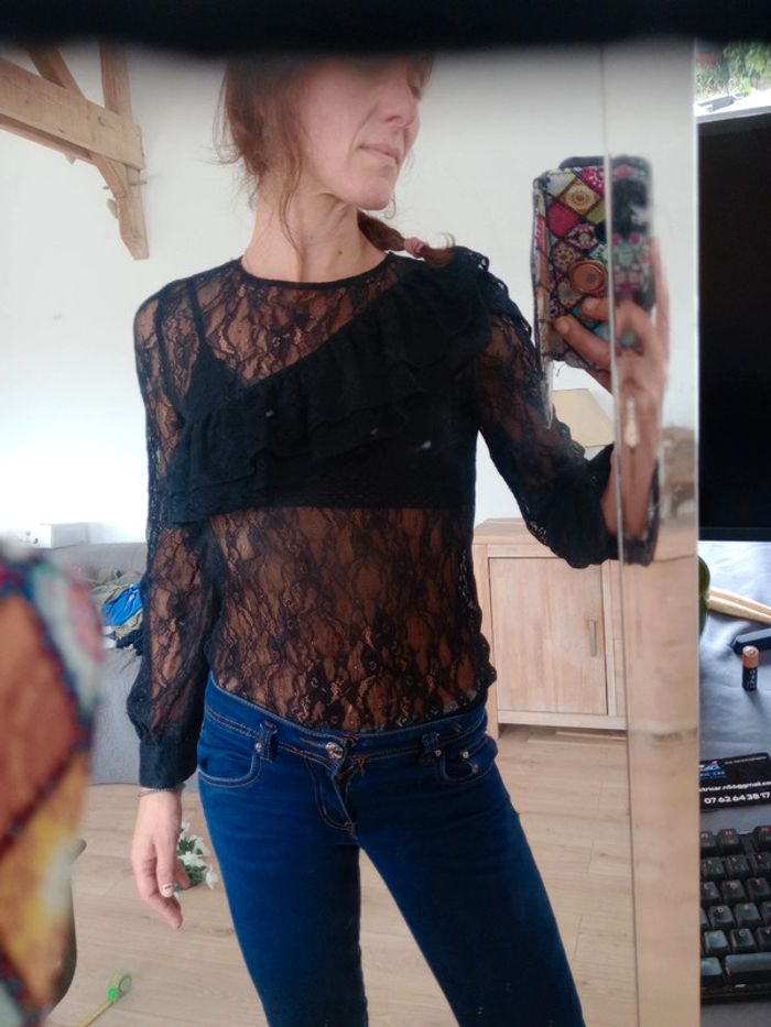 ✨ Haut transparent en dentelle noire, très élégant et féminin ✨ Détail volant sur le devant pour une touche romantique... 2 pans qui partent de l'épaule droite pour arriver devant 🥰 ✨ Manches longues légèrement bouffantes avec poignets resserrés ✨ Coupe ajustée, idéal à porter avec un jean taille haute ou une jupe ✨ Parfait pour une soirée, un événement ou un look chic du quotidien 💡 Porté ici avec un soutien-gorge noir (non inclus) 🖤 Taille S – Convient à un 34/36 Très bon état, peu porté Plus d'étiquette matière #carineleray_femme_34 #carineleray_femme_36 #dentelle #hautnoir #lookchic #tailleS #topsoirée #femme