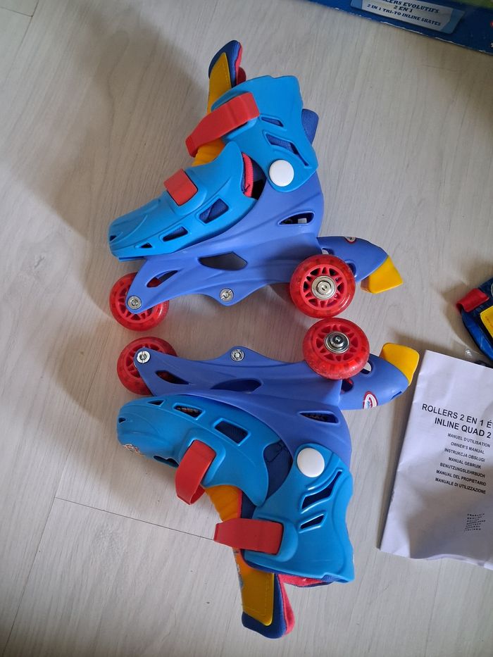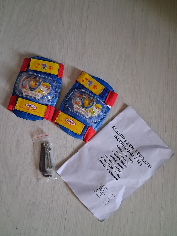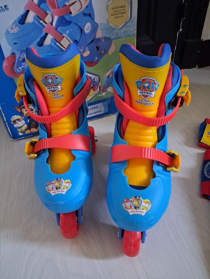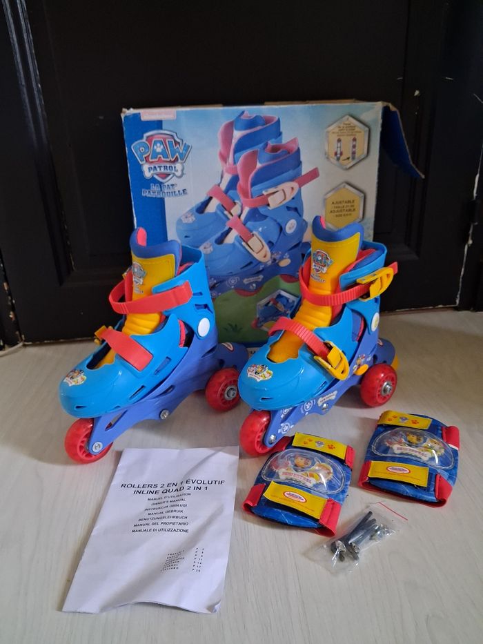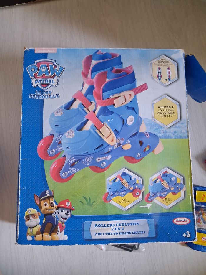 Rollers évolutifs T 27/ 30 Marque NICKELODEON Couleur bleu avec motifs Pat Patrouille Fonction Rollers ou patin Avec sa notice , c'est protège genoux, c'est clés pour changer les roues et sa boîte d'origine qui présente des imperfections Quasi neuf utilisé maxi 1 heure
