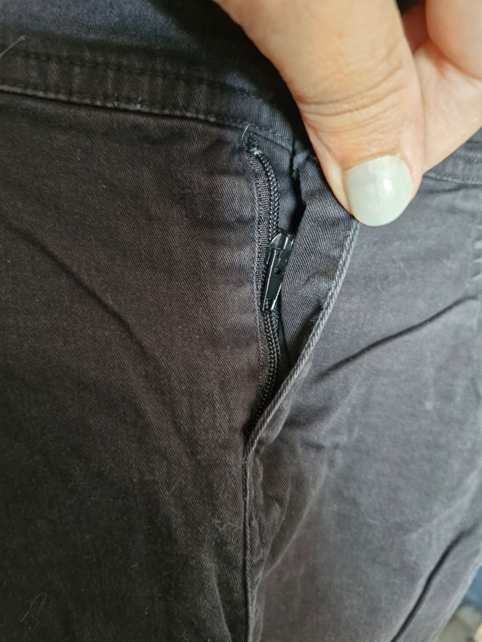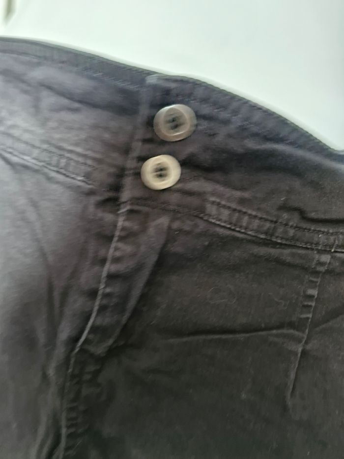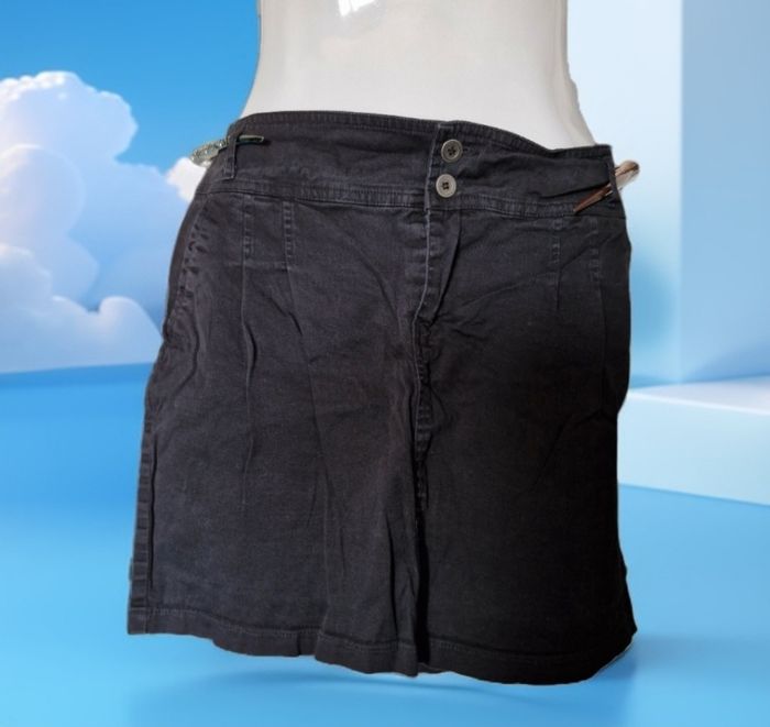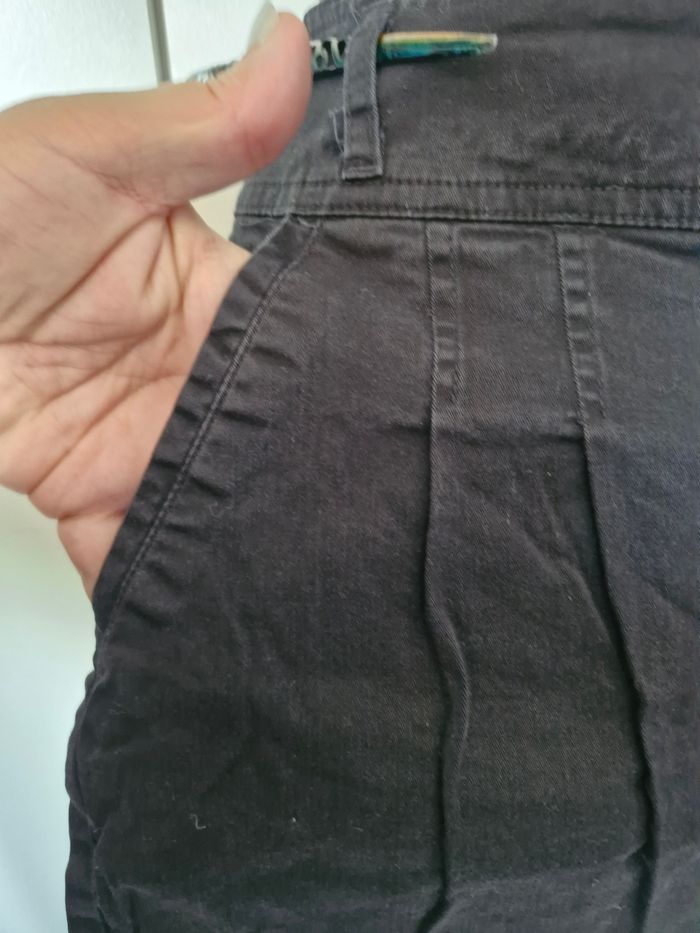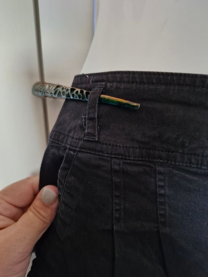 Très jolie mini-jupe noire semblant jean (mais en matière plus fine et plus extensible) Jolies poches plaquées de chaque côté, et pinces pour affiner la silhouette sans "serrer" La ceinture large est rehaussé par 2 petits boutons, auxquels s'ajoute une fermeture zip. 2 fausses poches plaquées a l'arrière. Pas de taille affichée mais les mesures donnerai un 42/44👇 Taille : de 40cms a plat a 43cms en tirant Hauteur 40cms Je n'ai pas remarqué d'anomalie