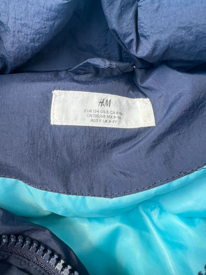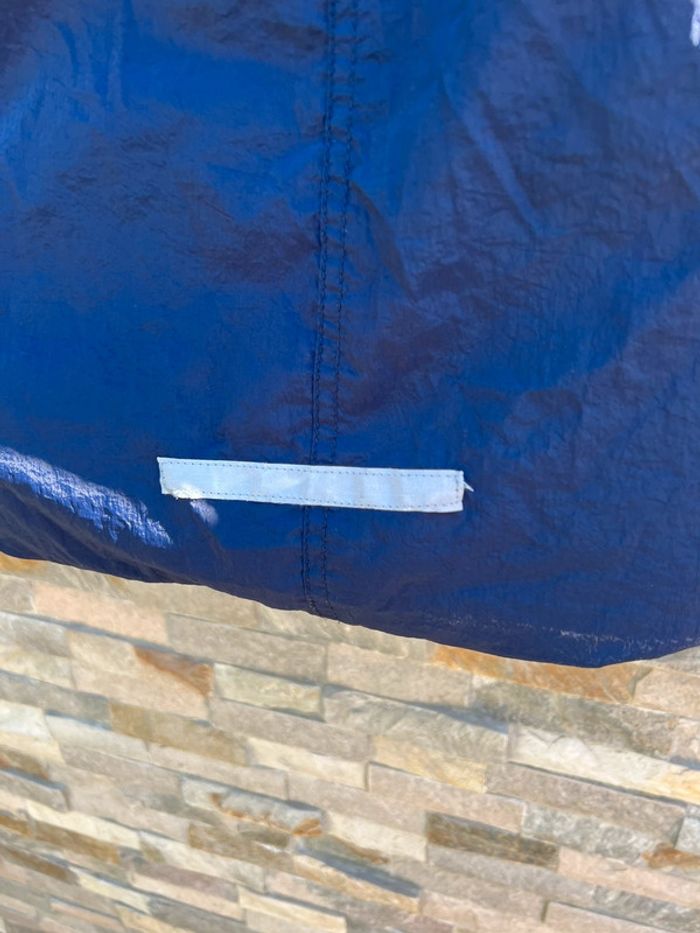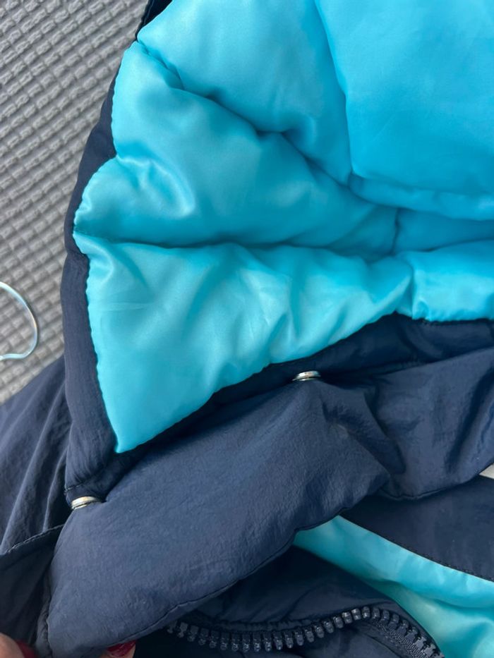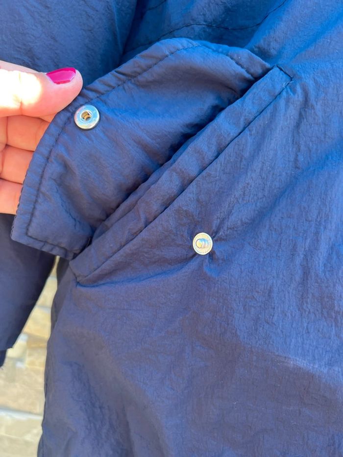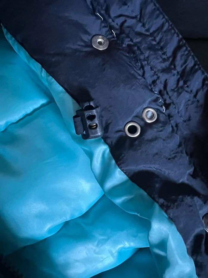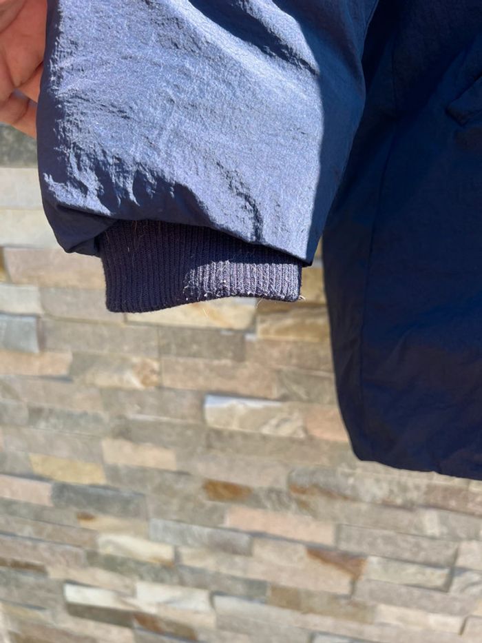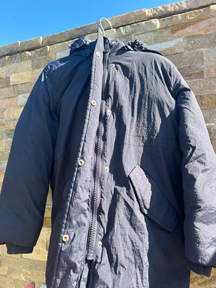 Taille 134cm. Parka en nylon, matelassés avec capuche amovible doublée. Modèle à colle droit avec rabat coupe-vent, muni de boutons, pression, dissimulé, et fermeture à glissière, surmontée d’un protège menton, qui limite le risque de frottement. Lien de serrage élastique, dissimulé à la taille manquant ( voir photo). Poches avec rabat fermé par bouton-pression dissimulé devant. Prix d’achat 44,99€.