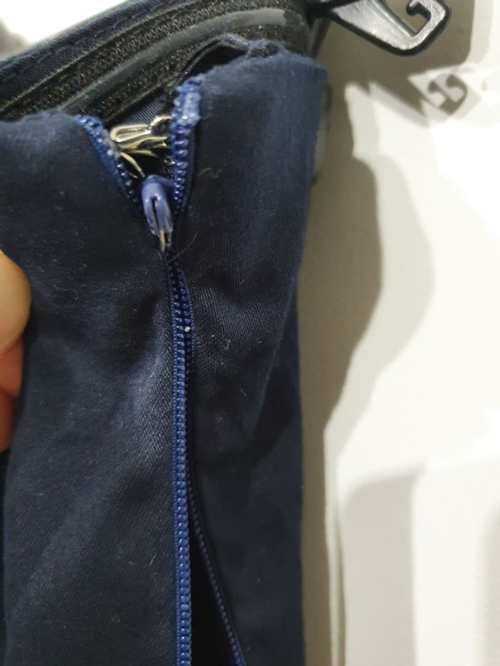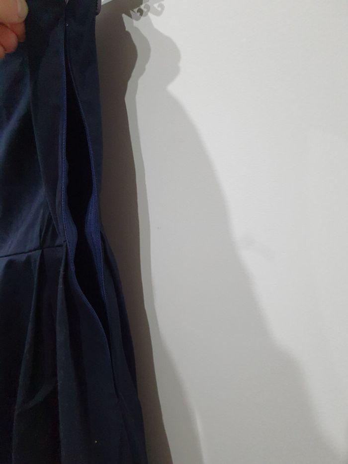 Fermeture invisible cassée. Voir photo Un crochet en haut de la fermeture. Bande silicone au niveau du bustier pour un bon maintien