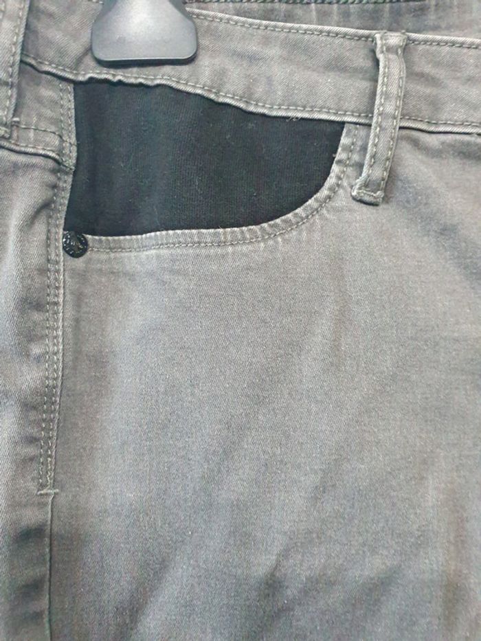 Jeans gris et élastique noir au dessus des poches et intérieur des jambes 99% coton 1% eslastane