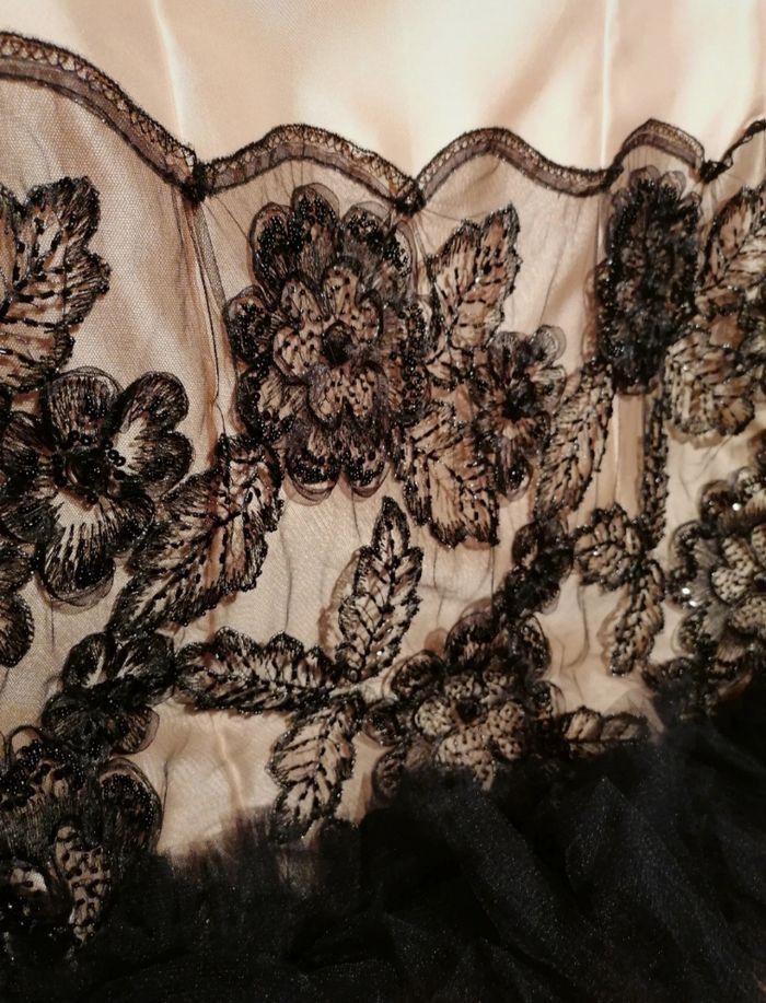 Robe de coktail de la marque BARCELOME, tule au niveau du bustier et dentelle avec perle sur le bas de la robe. Petite taille 34/36 Neuve, étiquette encore dessus ( 910 €)