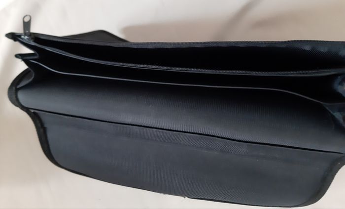 hauteur : 29 cm longueur : 38 cm 3 compartiments dont 1 qui se ferme par une fermeture éclair fabriqué en France En très bon état. Juste de légères marques au dos. (voir photo)