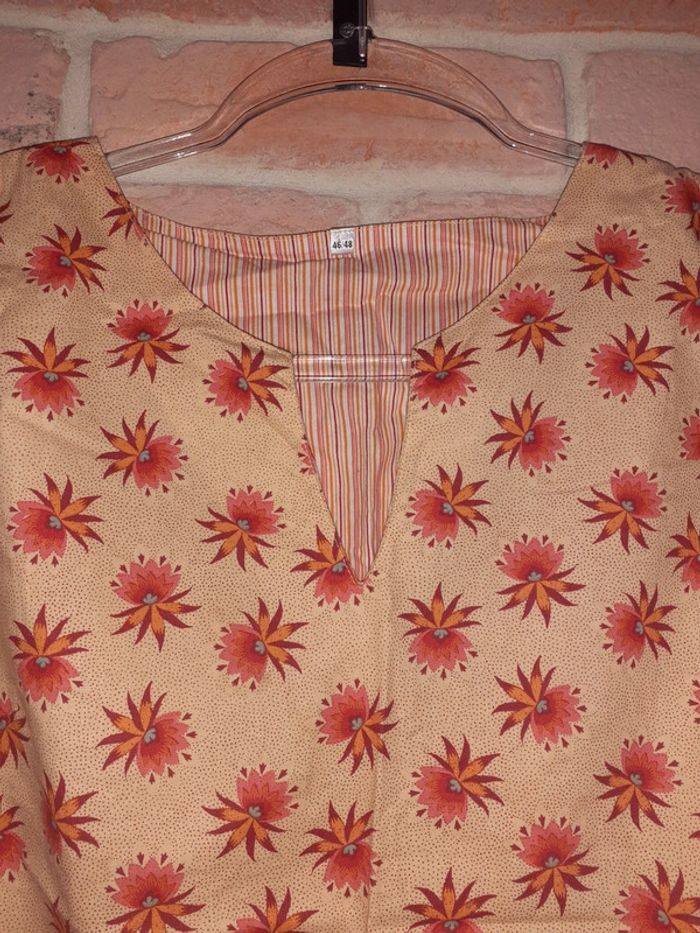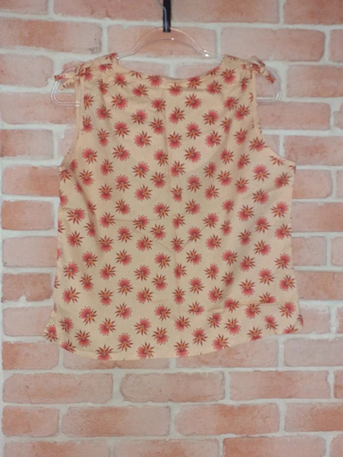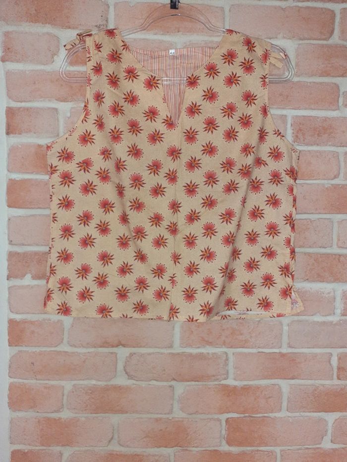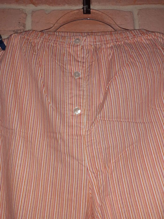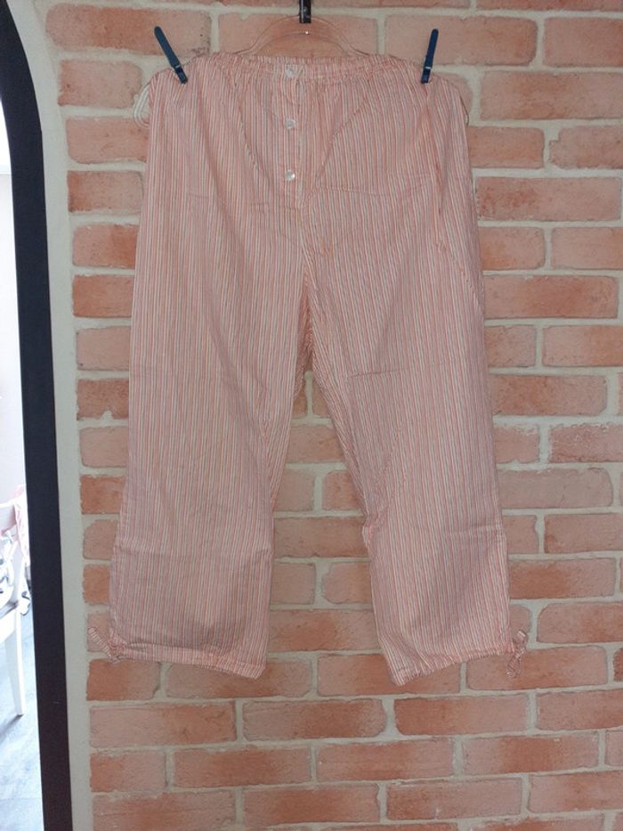 Joli pyjama 2 pièces : - Haut sans manches à motifs floraux et encolure en v doublée en tissu rayé (le même que celui du bas) - Bas style pantacourt en tissu rayé avec fermeture par boutons devant. Bas resserrable par liens. Taille : 46/48