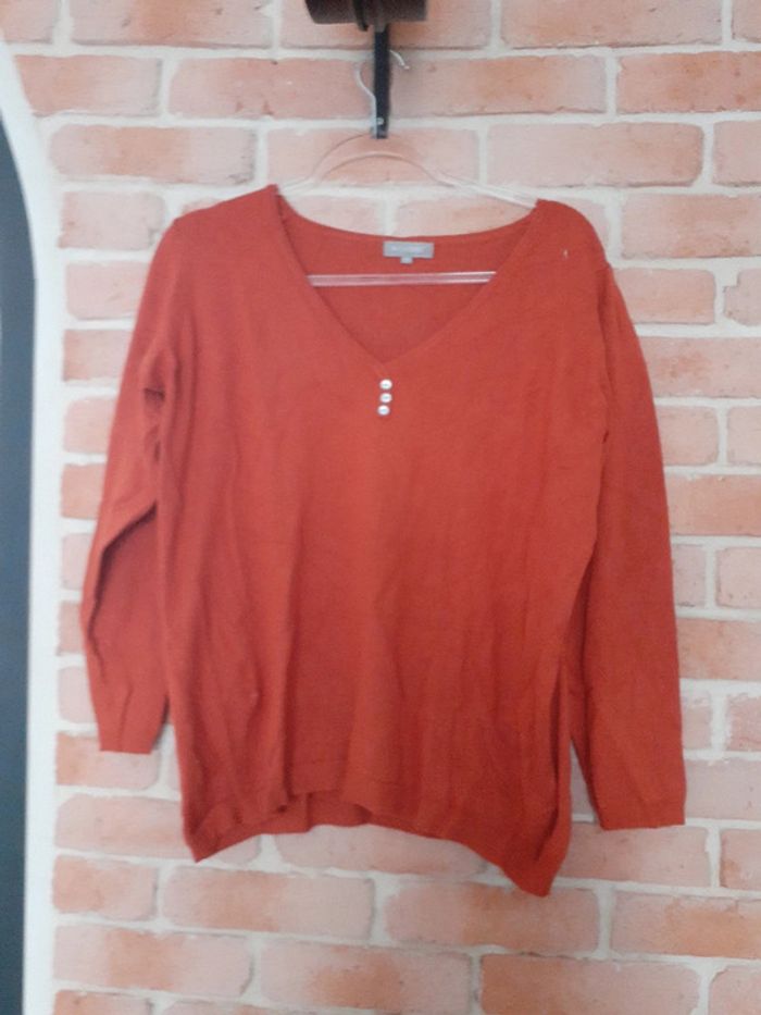 Pull léger en maille en viscose et polyamide Encolure en V avec petits boutons nacrés Couleur : orange foncé Marque : in extenso