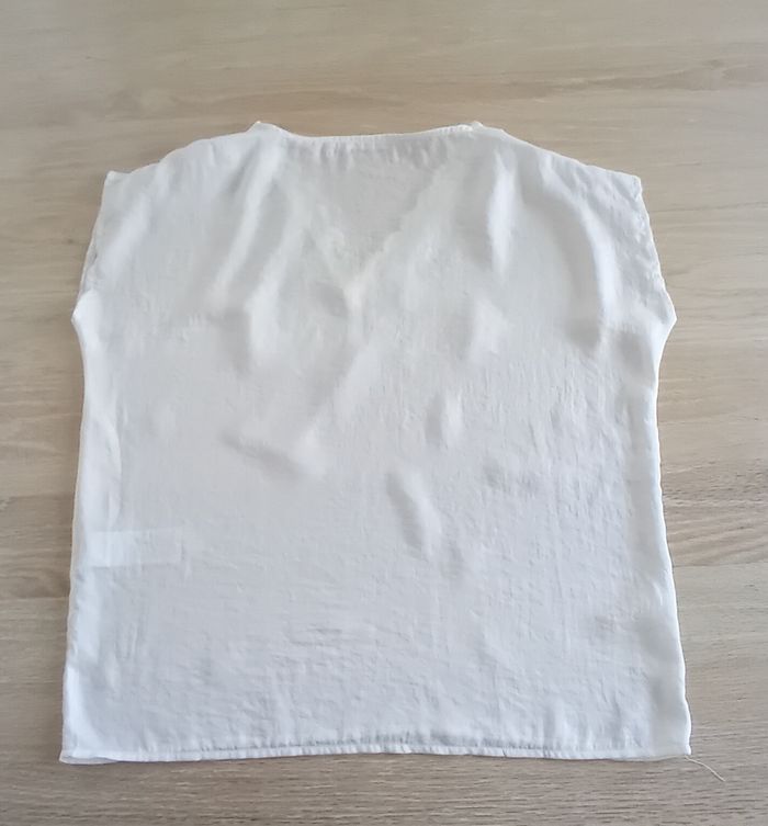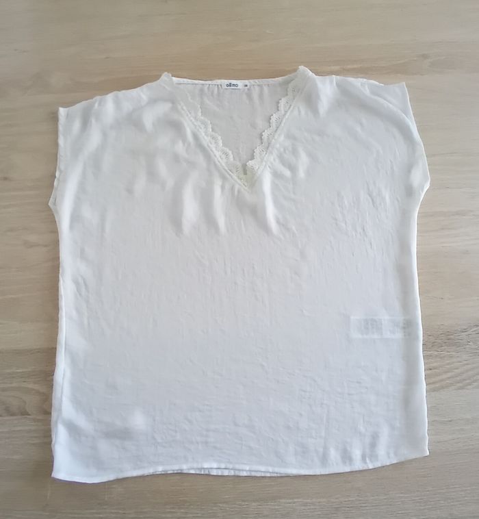 T-shirt femme de marque Gémo neuf (jamais porté, seulement lavé et repassé). Taille : 38 Couleur : blanc Col V en dentelle. Tissu léger et soyeux. #femme38sigtmoi #femmemsigtmoi
