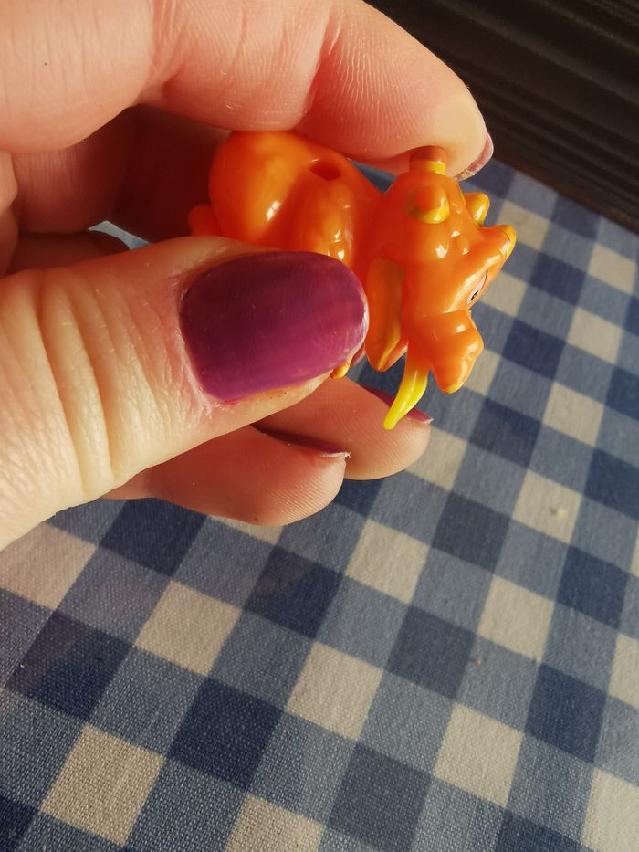 Figurine dragon orange Kinder, en plastique, en très bon état général, la peinture jaune est un peu écaillée. Taille 3,5 cm, poids 6g.